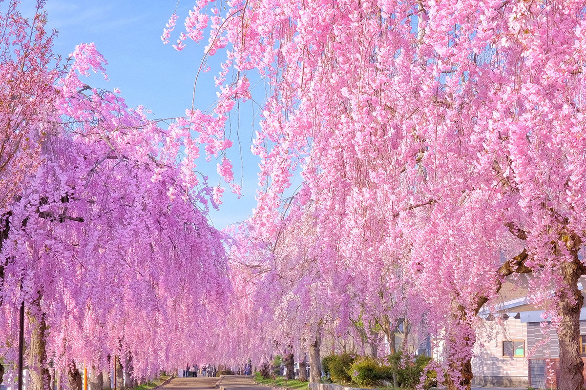 江戸初期の面影を残す角館武家屋敷通りでは、武家屋敷とともにシダレザクラがつくる歴史情緒あふれる景色が広がります。桜は、佐竹北家二代目正室が京都から持参した3本の苗木が始まりと伝わり、今では通り全体を彩る春の名物に。着物が似合う雅な町並みを歩き、桧木内川堤へ向かえばソメイヨシノのトンネルも楽しめ、散策しながら多彩な桜風景を堪能できます。