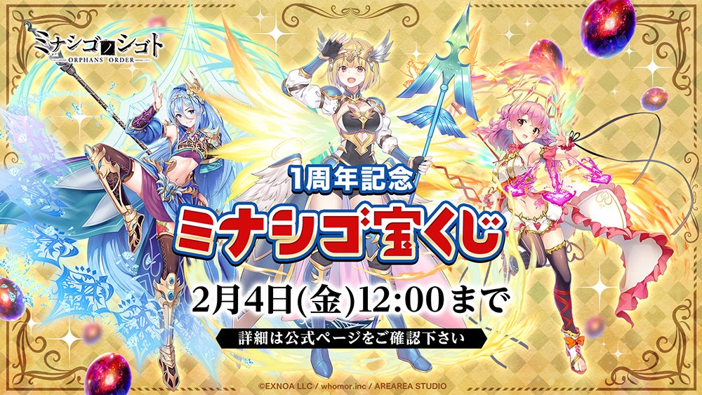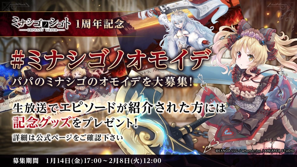 合同会社EXNOA(本社:東京都港区、CEO:村中 悠介、URL:https://games.dmm.com/)は1月14日(金)に、ターン制コマンドバトルRPG『ミナシゴノシゴト』(https://entry-site.minashigo-yusya.com/)の「ミナシゴノシゴト1周年記念キャンペーン」を開始いたしました。また合わせて、「ミナシゴノシゴト1周年記念の生放送」を2月9日(水)に配信決定したことをお知らせいたします。