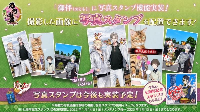 いろいろな場所へ近侍を伴い、写真を撮影することができる「御伴」に、撮影後、撮影した画像へ写真スタンプを配置できる「写真スタンプ」機能が追加されます。