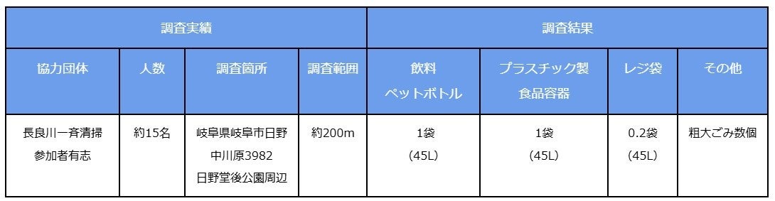 長良川一斉清掃にて参加者の有志の皆様と協力して実施した調査概要及び調査結果を上記表にまとめています。