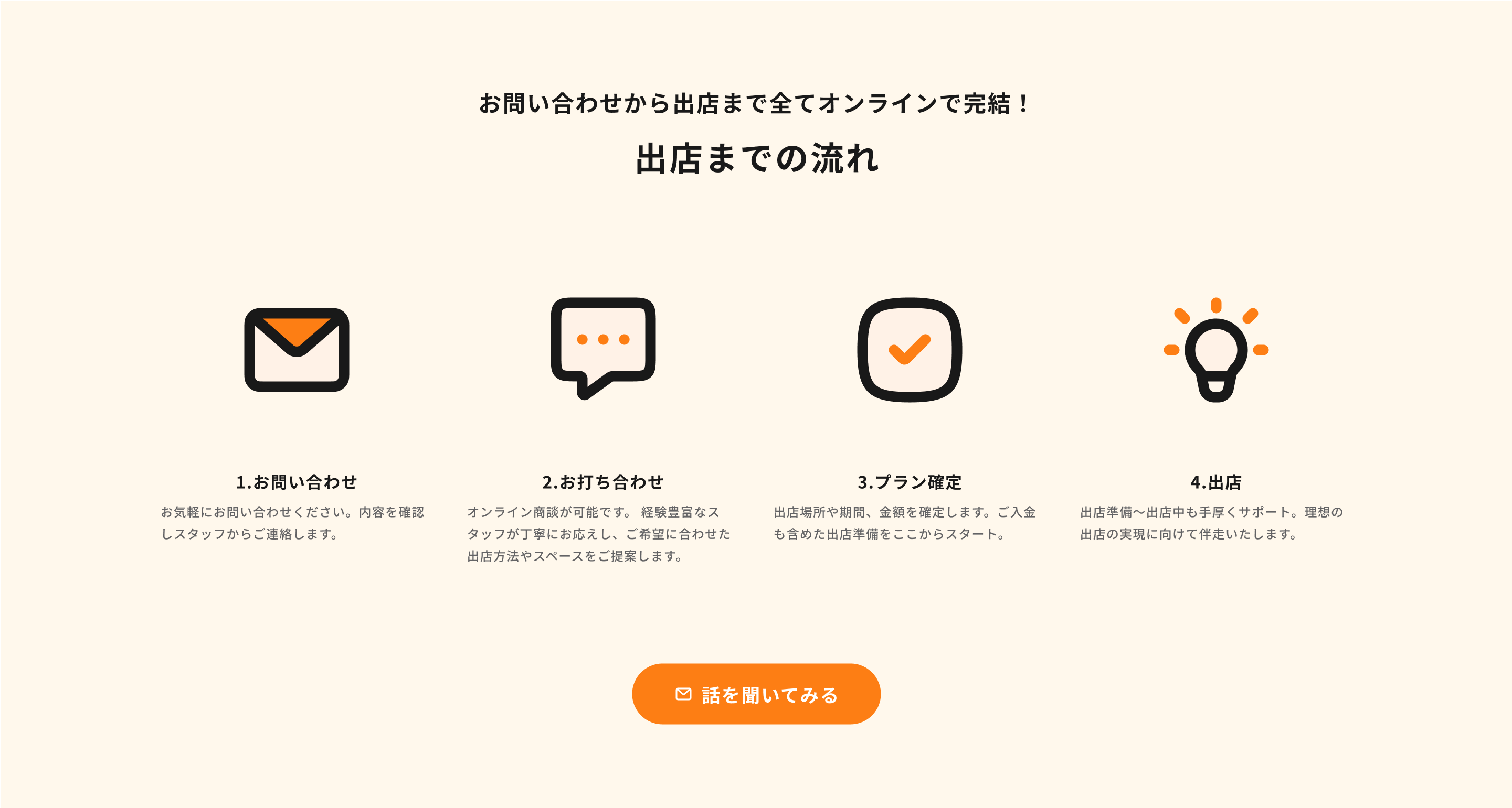 リアル店舗の出店が未経験の個人事業主さま・ECを専業にされている事業者さまをはじめ、多店舗で展開を希望されている事業者さまも、気軽に出店をご検討いただけます。
