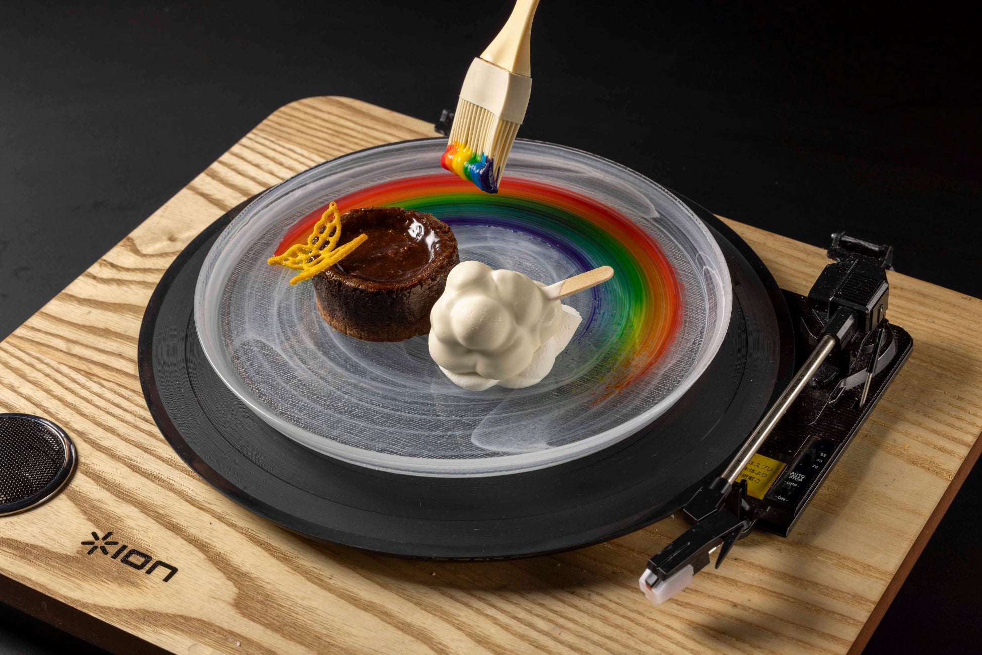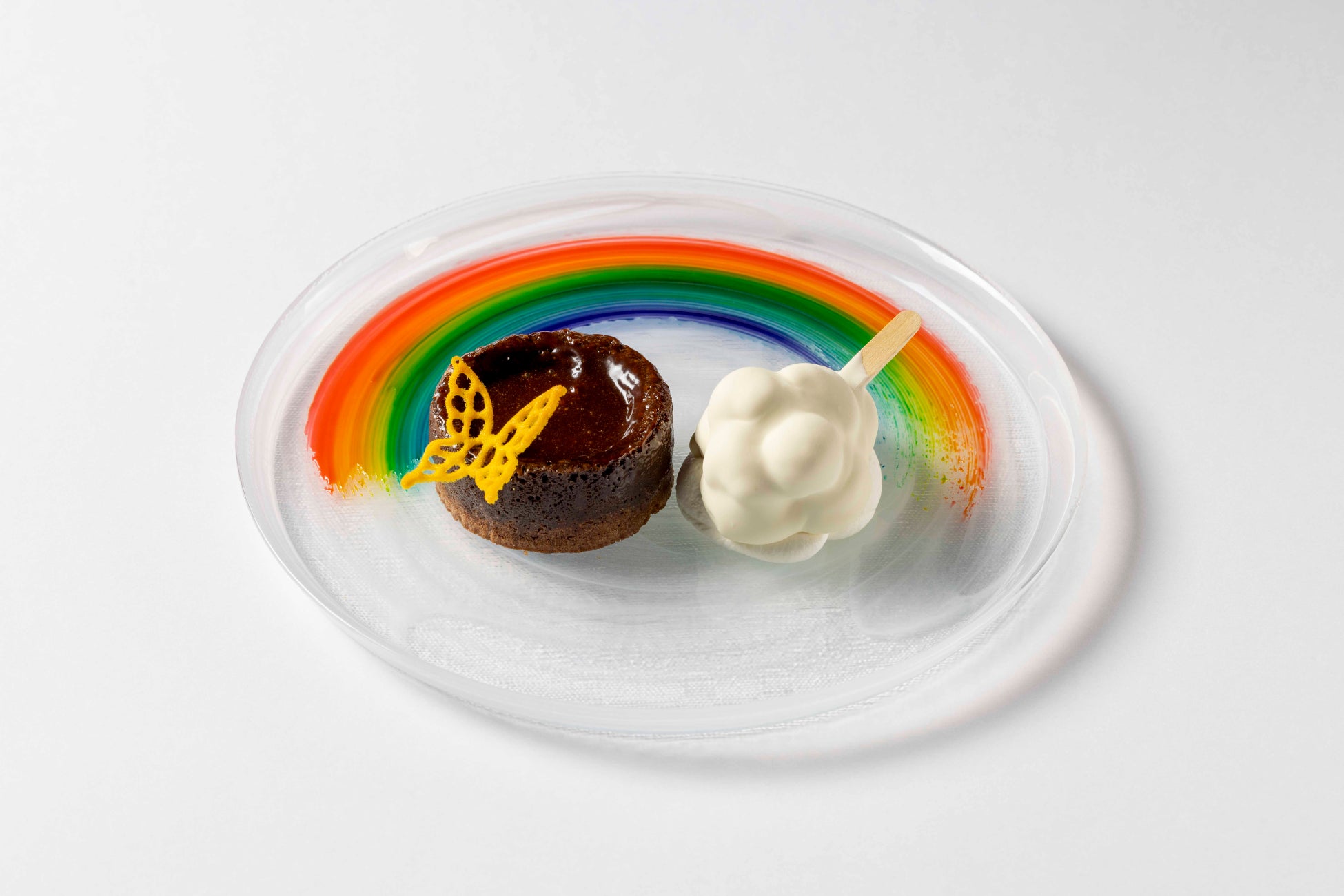 濃厚なチョコレートが中から溶け出す人気のデザートをプライド月間に合わせたアレンジでご用意いたします。晴れやかな空にかかるような鮮やかな虹はレコードプレイヤーの回転を利用して描き、空に浮かぶモクモクとした雲をイメージしたアイスキャンディーを添えました。