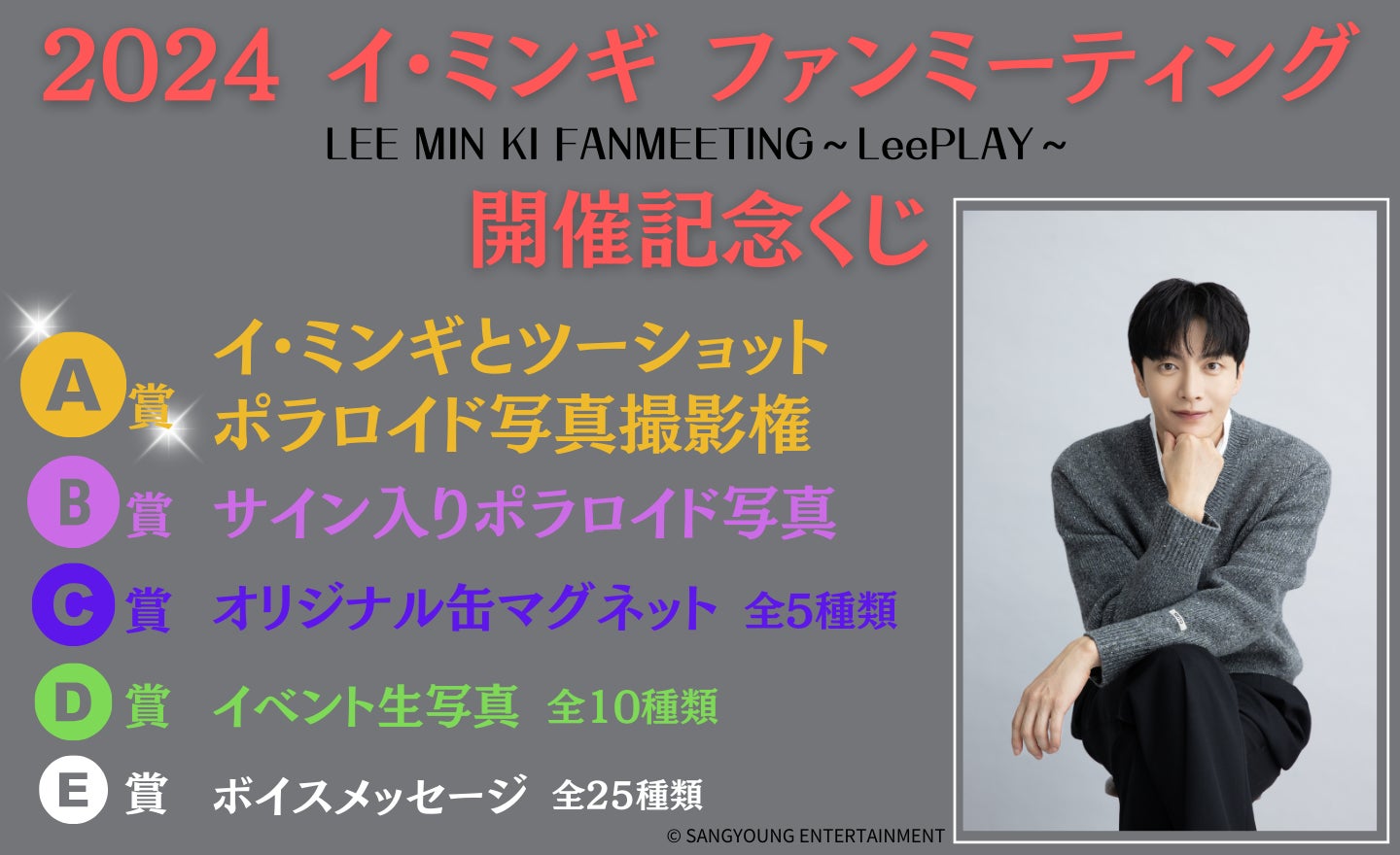 ファンミーティング当日にイ・ミンギとツーショットポラロイドが撮れる撮影権や、サイン入りポラロイド写真、本オンラインくじのために作成したオリジナル缶マグネットなど、様々な賞品をご用意しております。