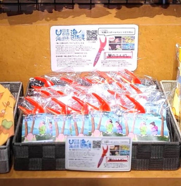 一般社団法人日本昔ばなし協会と日本財団が取り組む「海ノ民話のまちプロジェクト」では、鳥取県鳥取市に伝わる民話「蟹のふんどし」のアニメ完成を記念して、鳥取市のお土産を取り扱う(有)大和商会の人気商品「松葉ガニボールペン」の「蟹のふんどし」コラボバージョンを、2025年1月6日(金)に発売しました。