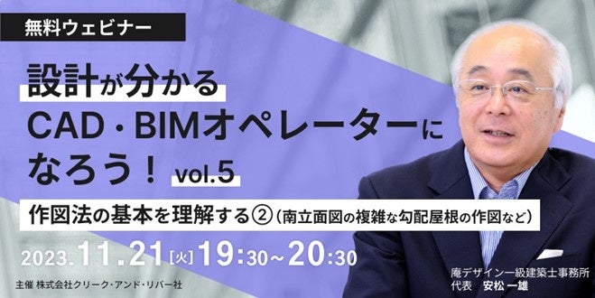 【建築業界】設計を理解できるCAD・BIMオペレーターにステップアップしよう!11/21(火)無料セミナー「作図法の基本を理解する[2](南立面図の複雑な勾配屋根の作図など)」