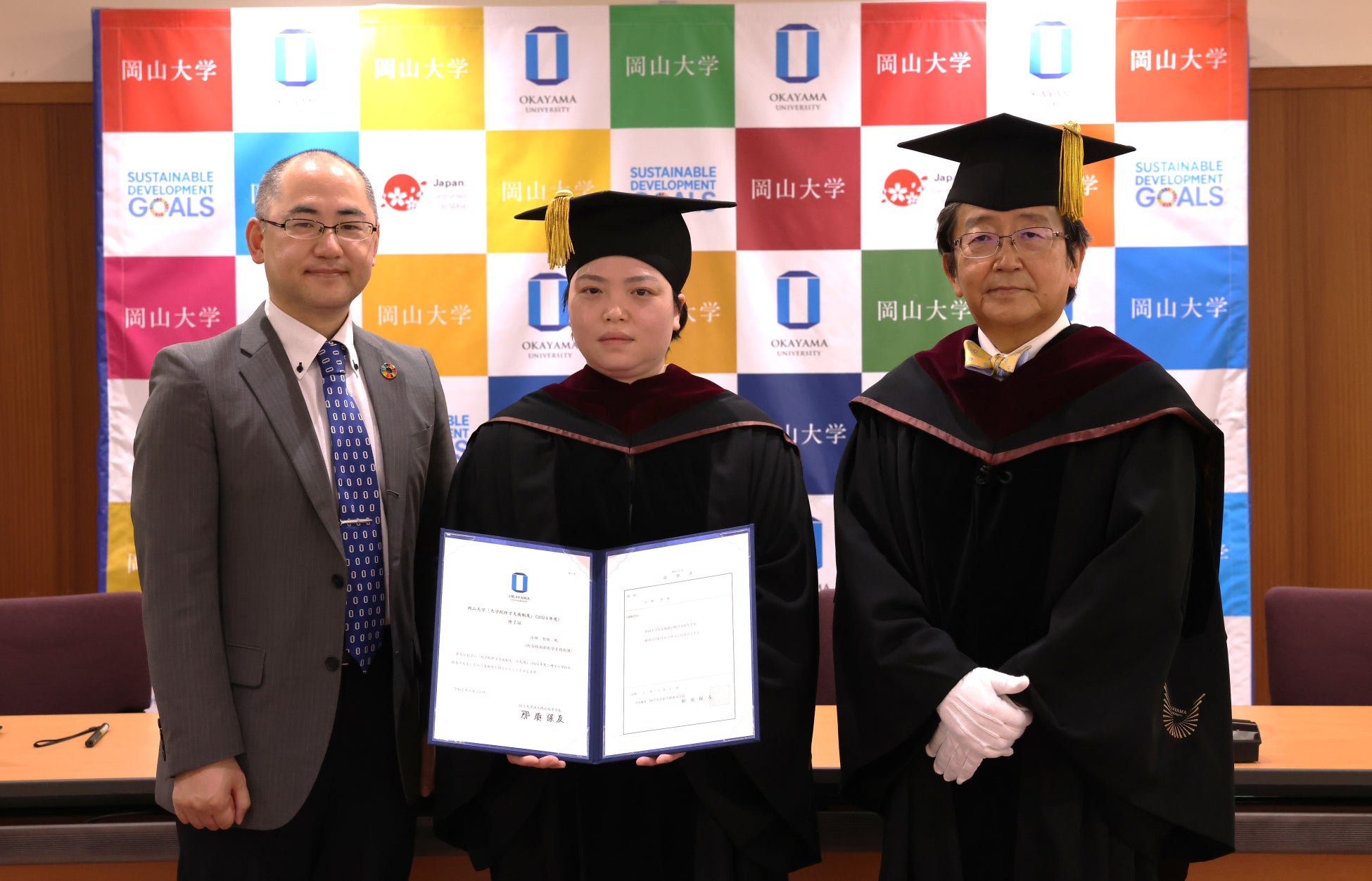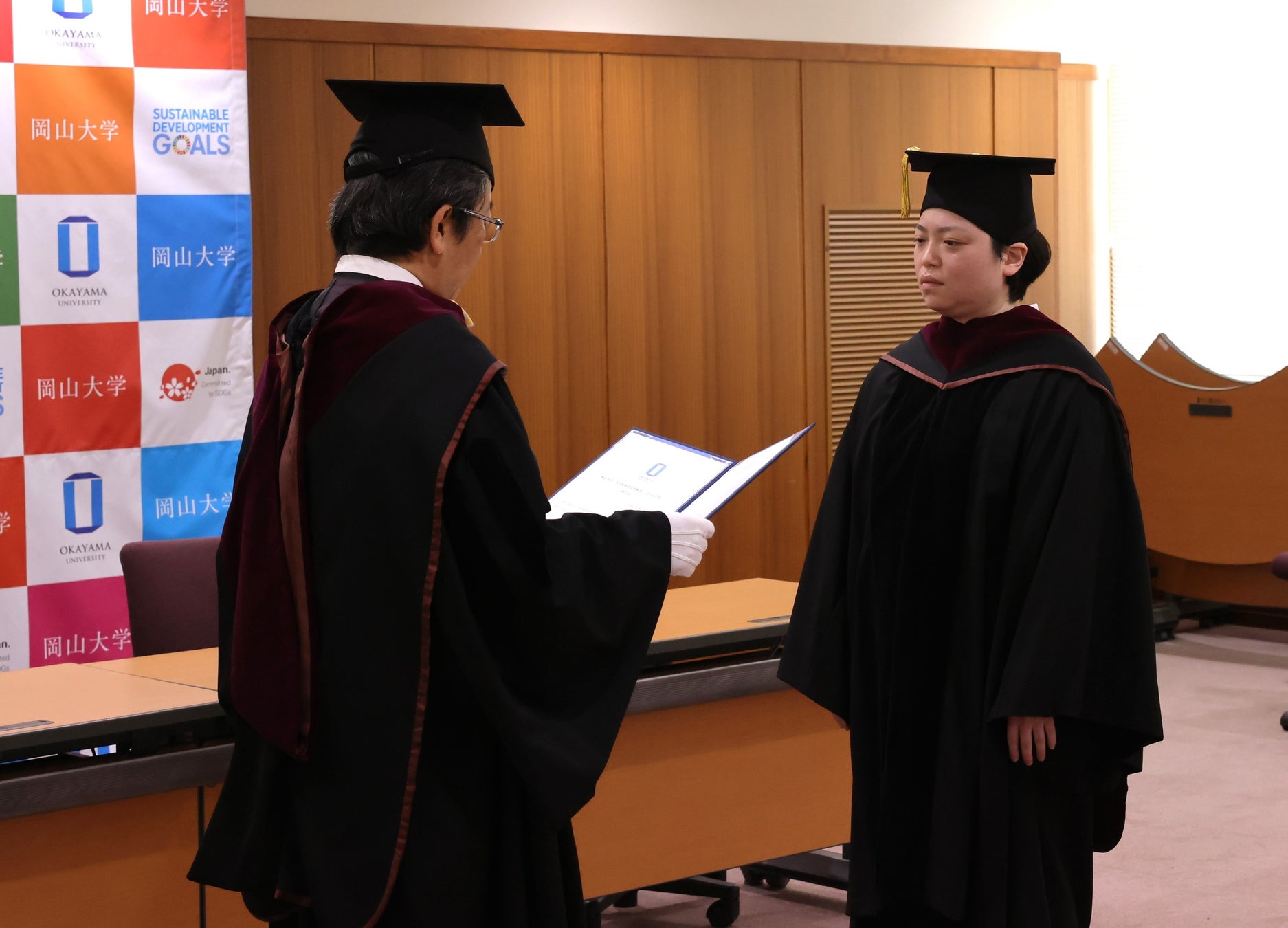 国立大学法人岡山大学(本部:岡山市北区、学長:那須保友)は2025年5月22日、2024年度から実施している「大学院修学支援制度」を利用して初めてとなる博士号取得者の修了式を、本学津島キャンパスの本部棟で挙行しました。