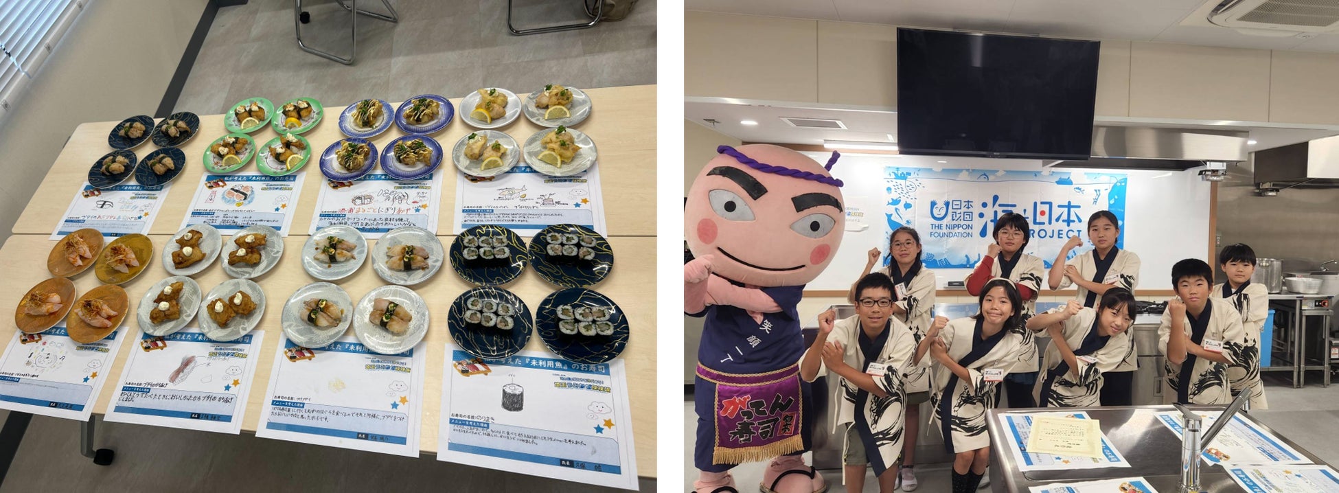 また、勝浦市では専門家指導のもと、漁体験を行い、現在海で深刻な問題となっている“磯焼け”についても学びました。「磯焼け」の要因のひとつと言われているブダイは、市場で値がつかず「未利用魚」に分類されています。ブダイを活用するため、児童たちがイベントでの学びの成果として、学習内容から着想を得てブダイのお寿司を考えました。