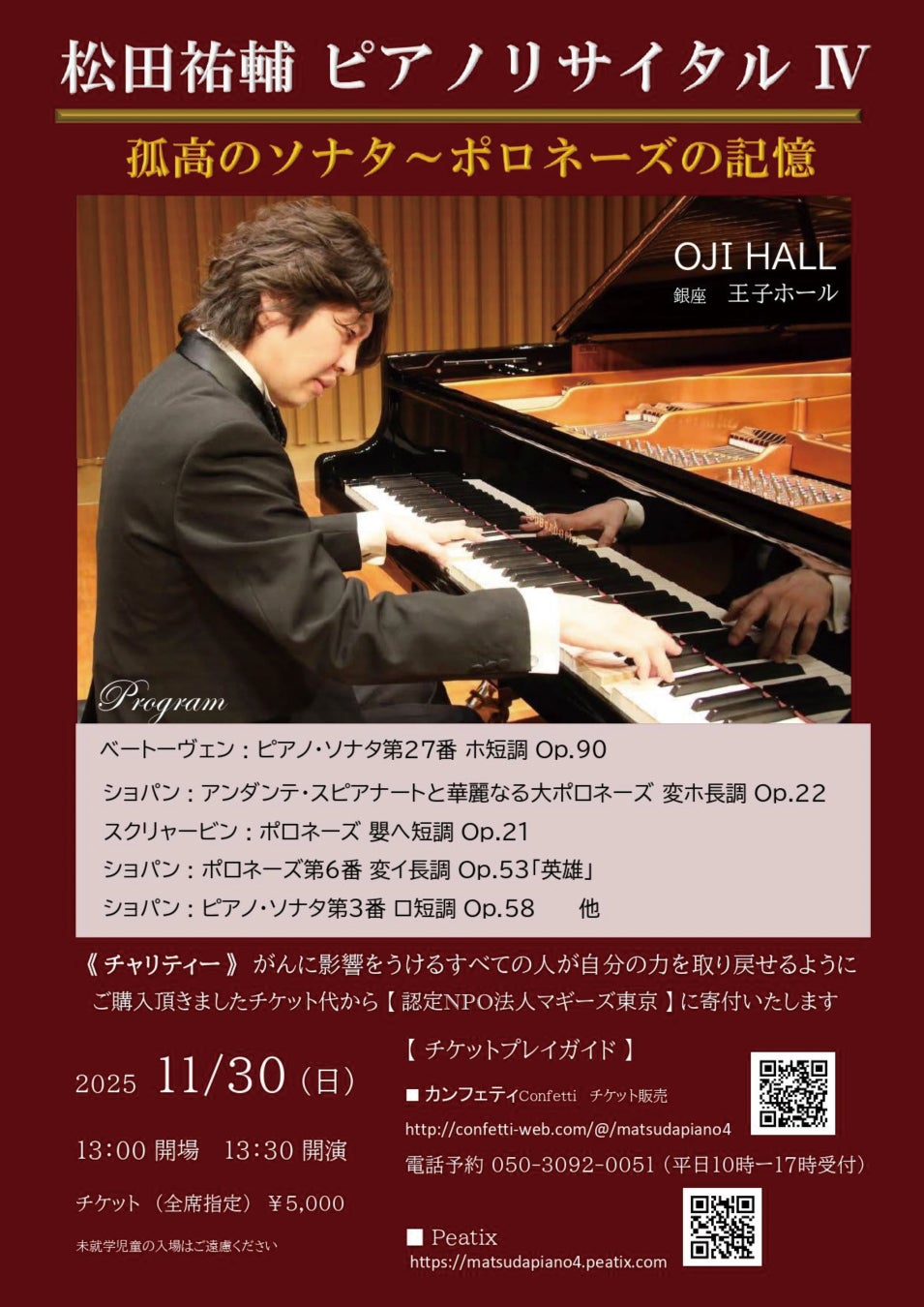 『松田祐輔ピアノリサイタルIV 孤高のソナタ~ポロネーズの記憶』が2025年11月30日(日)に王子ホール(東京都中央区銀座4-7-5)にて開催されます。 チケットはカンフェティ(運営:ロングランプランニング株式会社、東京都新宿区、代表取締役:榑松 大剛)にて7月15日(火)9:00より発売開始です。