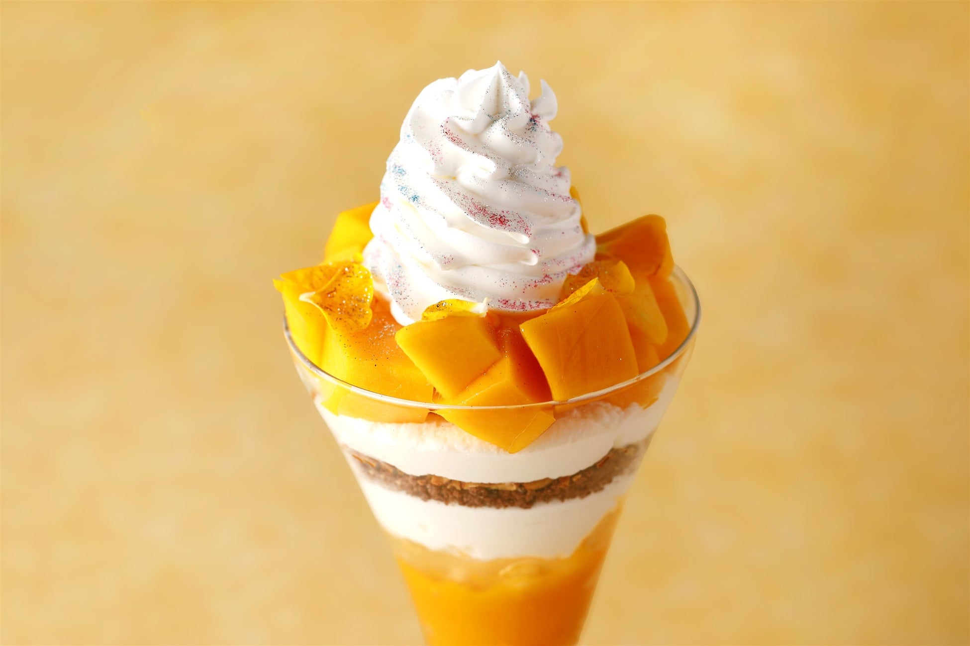 濃厚でジューシーな完熟マンゴーを使用した南国気分あふれる贅沢なパフェが季節限定で初登場!豊潤な香りととろけるような甘さが口いっぱいに広がり、まるでマンゴーそのものを味わっているかのよう。ソフトクリームや濃厚マンゴーソース、マスカルポーネクリームがマンゴーを引き立て、仕上げにカラフルなデコレーションパウダーをお客さま自身でかけて完成する至福のデザートです。