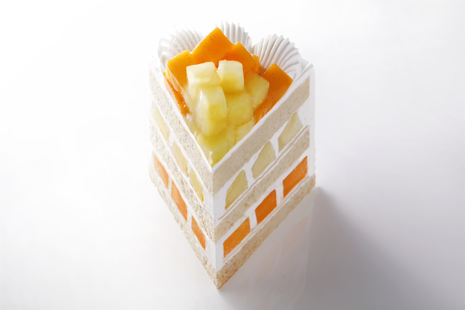 新作のショートケーキはメロンとマンゴー2つの旬のフルーツを使用した、1度で2つお愉しみいただける逸品。上品な香りと高い糖度を誇り、栄養や美味しさを凝縮させた静岡県産マスクメロンと、口に入れた瞬間とろける“太陽の果実”とも称される国産マンゴーを贅沢に使用した究極のショートケーキ。