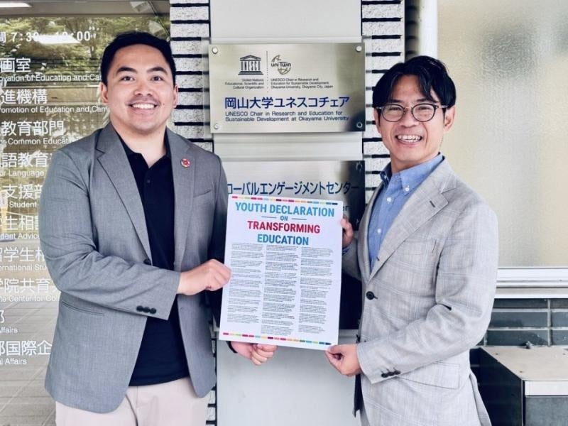 国立大学法人岡山大学(本部:岡山市北区、学長:那須保友)は2025年5月26日に、国連SDG4ハイレベル運営委員会の代表補佐であり、グローバルな若者の代表として活躍しているイラン・ウンベルガさんが、本学ユネスコチェアホルダーの横井篤文副学長(グローバル・エンゲージメント担当)を訪問しました。