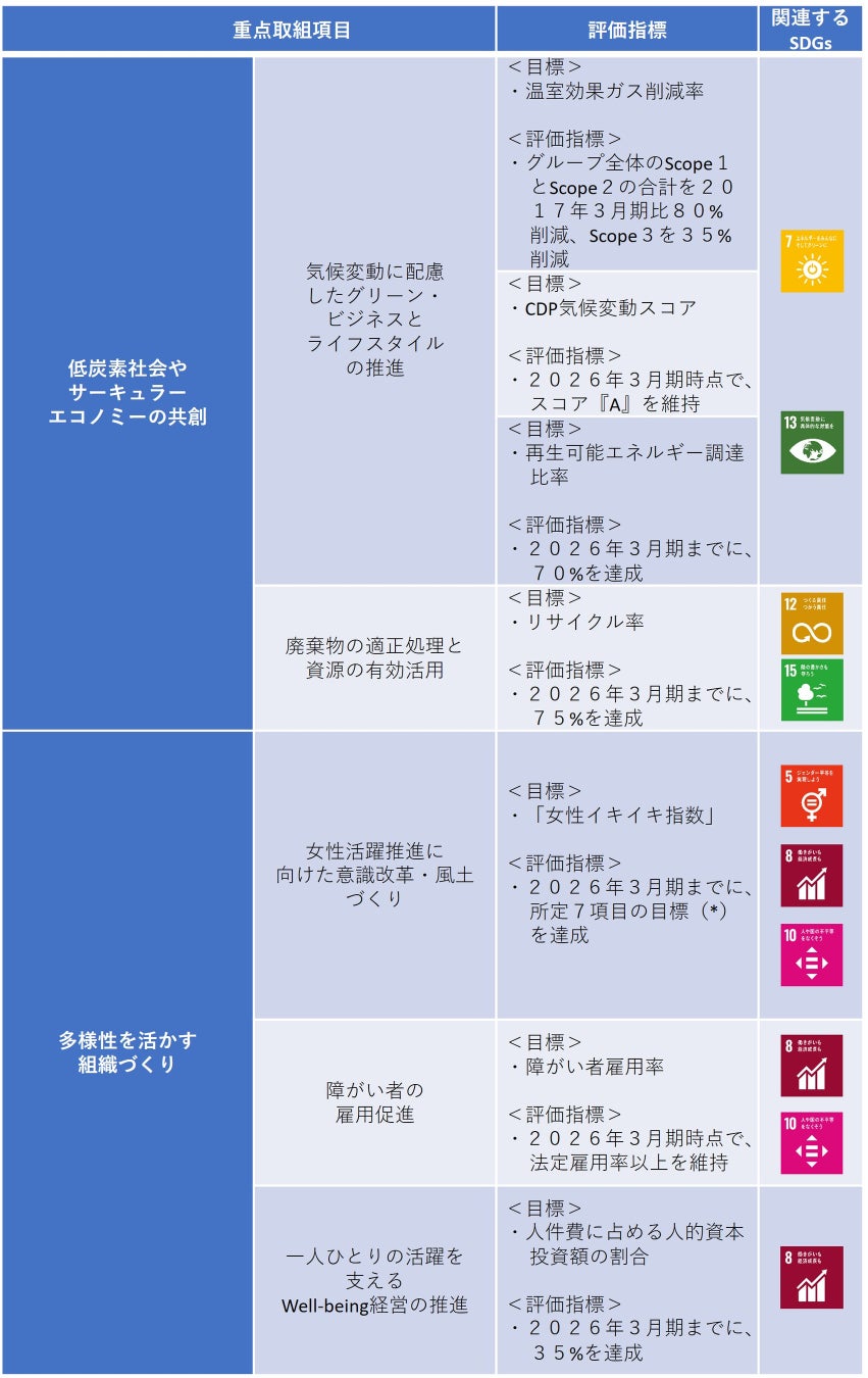 三井住友銀行が丸井グループとポジティブ・インパクト・ファイナンスを締結するにあたり、上記を踏まえ株式会社丸井グループの事業活動に関連する重要なインパクト領域を評価して決定した重点取組項目および評価指標は以下の通りです。