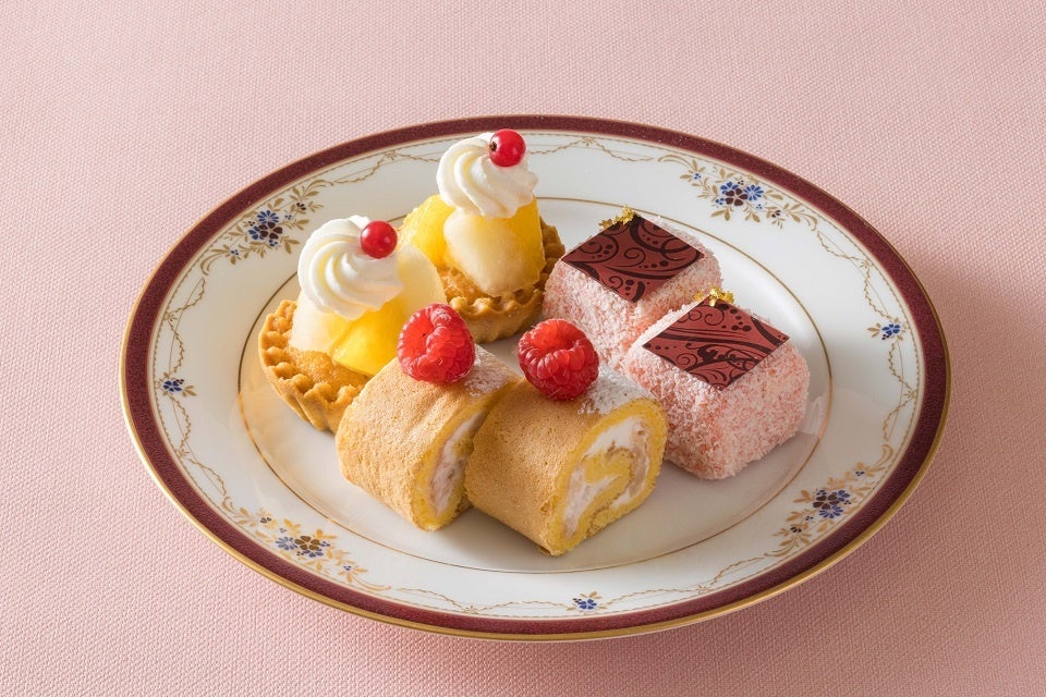 白桃と黄桃の2種類のタルト、ラミントン 白桃とフランボワーズフレーバー、白桃ジャム入りのロールケーキ