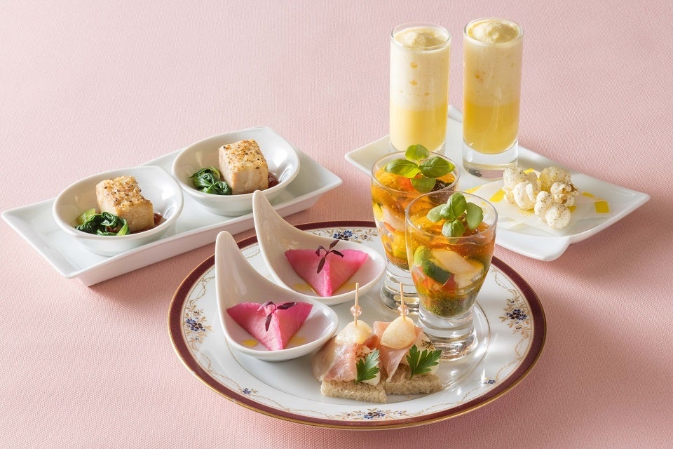 季節ごとにテーマが変わるラウンジ&ダイニングSORAEで人気のアフタヌーンティー。今年の夏は、ラウンジ&ダイニングSORAEで初となる“桃”をテーマにご用意いたします。繊細で上品な甘さの白桃と、白桃に比べ果肉の弾力を感じるジューシーな黄桃がどちらも一緒に楽しめる「白桃と黄桃の2種のタルト」をはじめ、桃の優しい風味が広がるふんわり食感の「白桃ジャム入りのロールケーキ」、ライチとフランボワーズのパンナコッタの上に白桃とジュレ、生クリームを重ねた華やかなグラスデザートなど、様々な桃スイーツが並びます。さらに、白桃の甘さがアクセントとなる「白桃と生ハム ポテトサラダのカナッペ」や、爽やかなバジルの風味に白桃と夏野菜がベストマッチの「白桃と夏野菜のジュレ バジルのアクセント」など、桃を使用したセイボリーもご用意。桃尽くしのアフタヌーンティーがご堪能いただけます。
