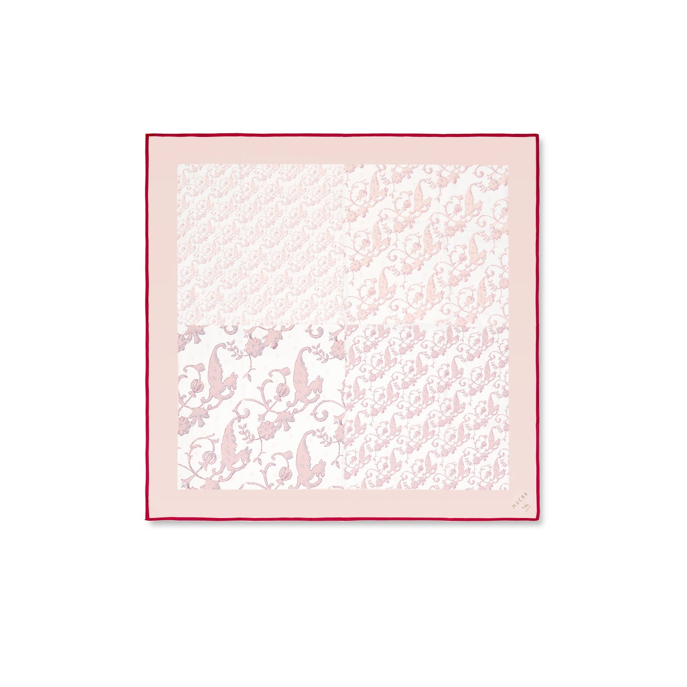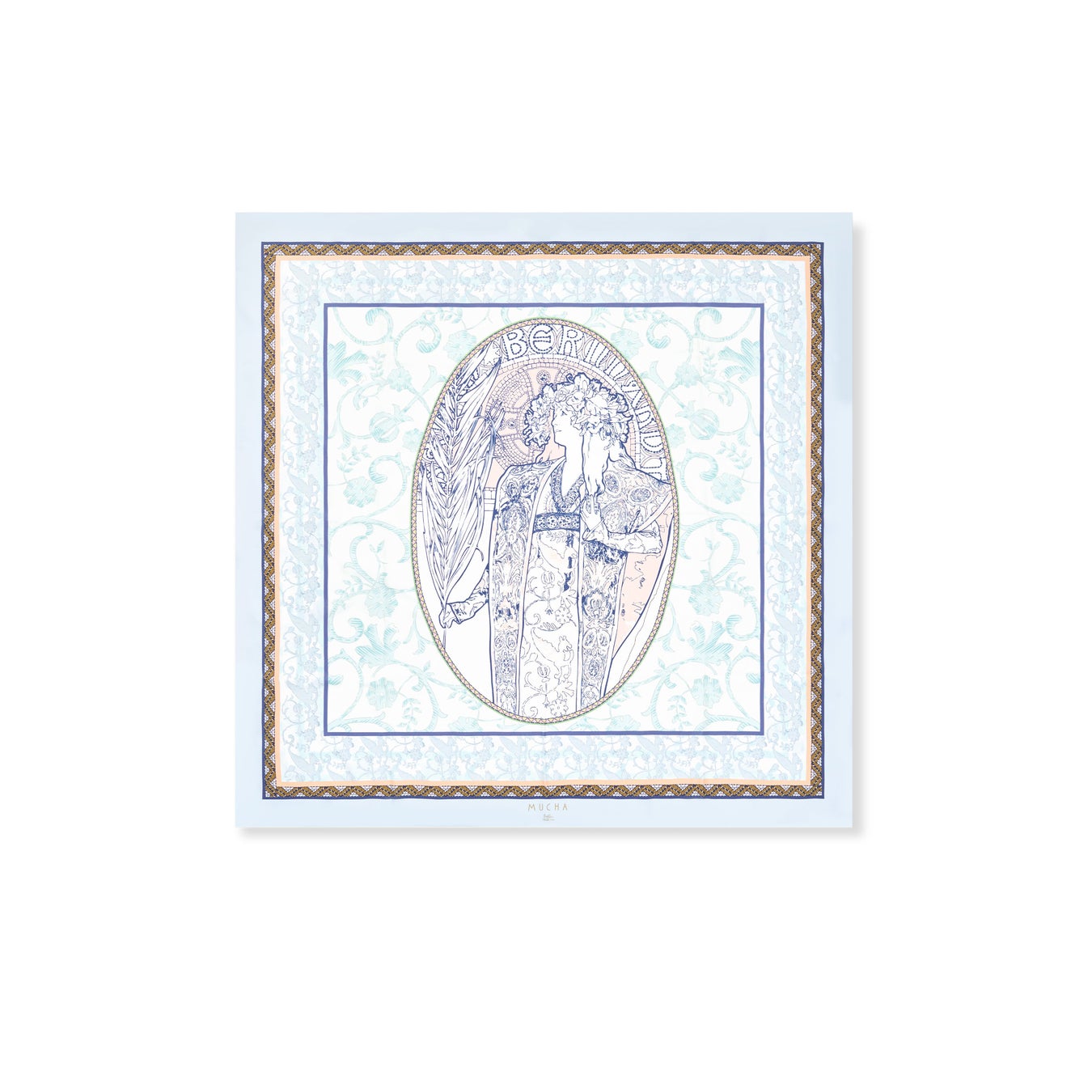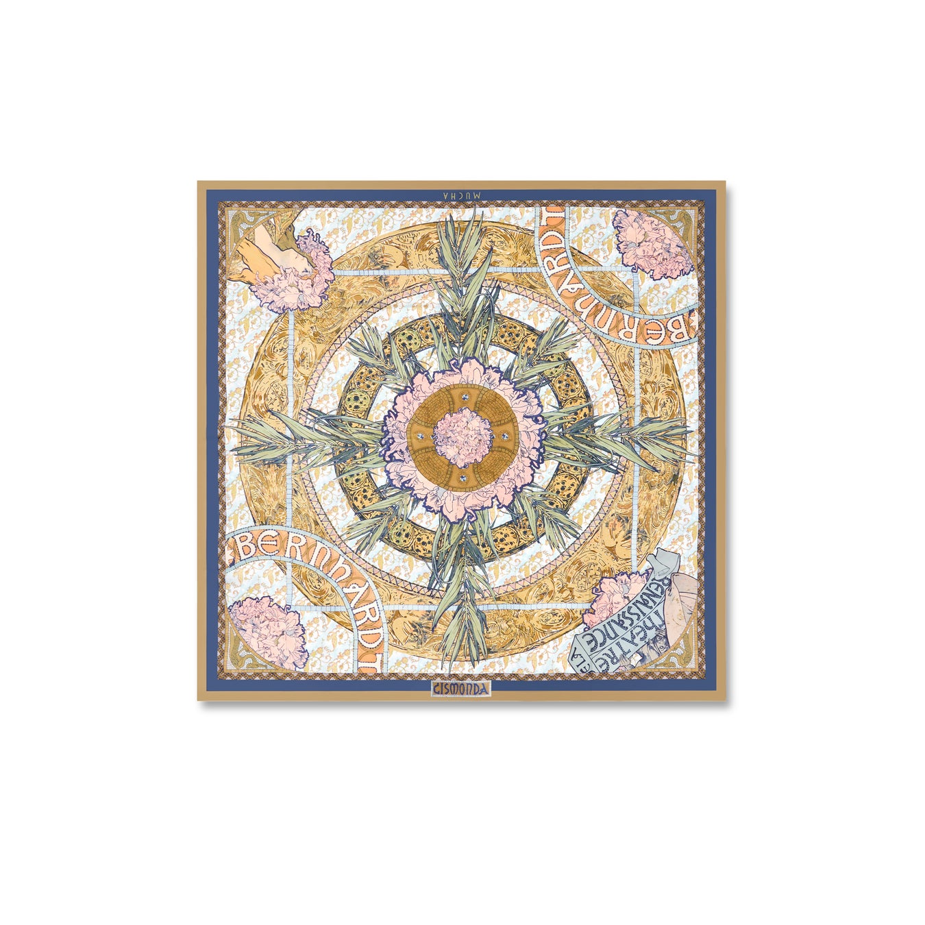シルク素材のスカーフは、ジスモンダのドレスに描かれている柄を総柄で表現したやわらかい印象のピンク、額縁のような装飾の中にジスモンダを大胆にデザインしたさわやかなブルー、アートの要素を総柄に落とし込むことで様々な印象を楽しめる高級感のあるゴールドの3色展開。身に纏うのはもちろん、バッグに巻いてコーディネートのアクセントとしての使用もおすすめです。