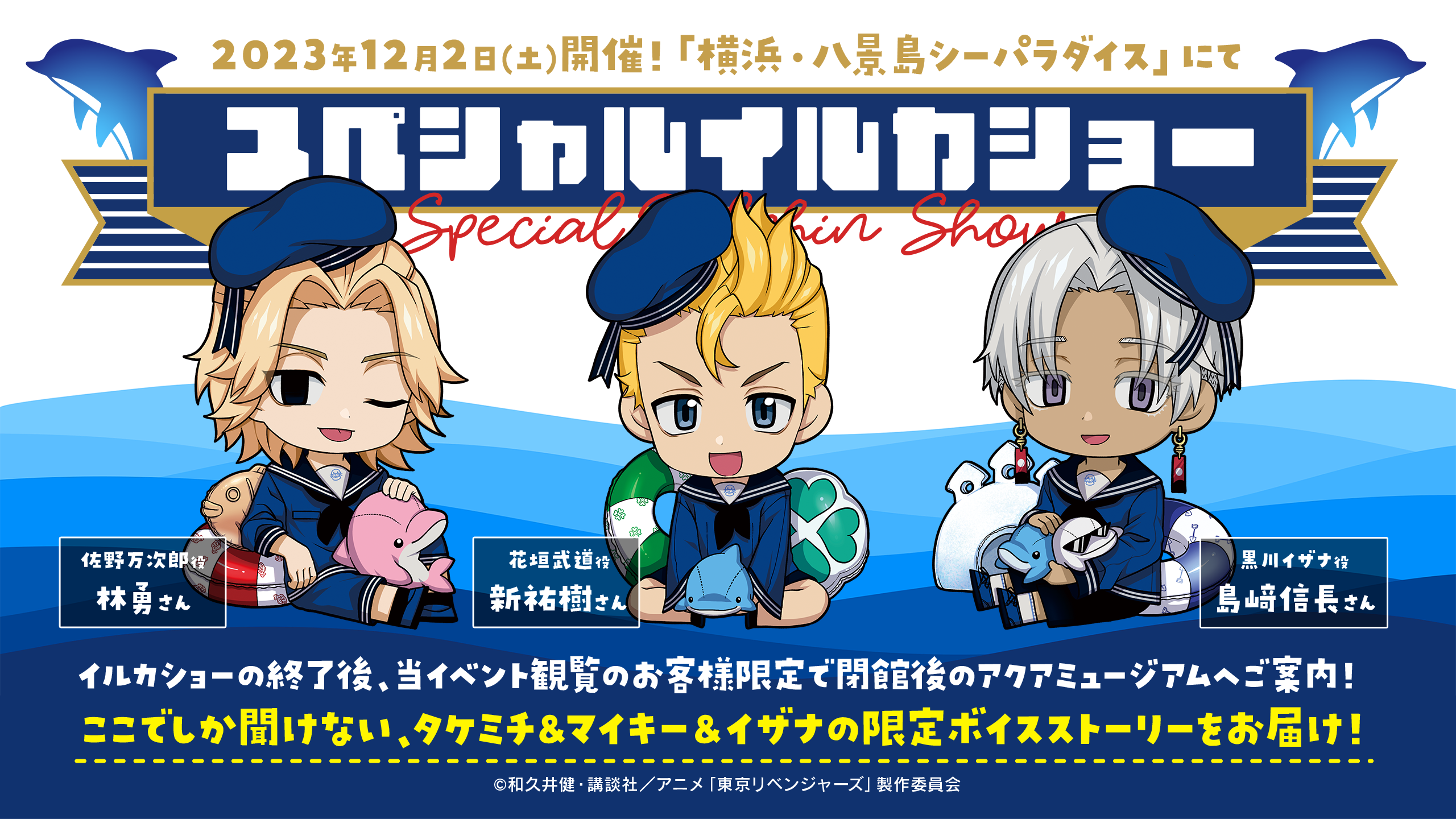 12月2日(土)には花垣武道役の新 祐樹さん、佐野万次郎役の林 勇さん、黒川イザナ役の島﨑 信長さんのキャスト3名を迎えて、この日だけの特別なステージを開催いたします。TVアニメ『東京リベンジャーズ』の楽曲に合わせて繰り広げられる、イルカたちの壮大なパフォーマンスは必見です。ステージ終了後にはステージイベントにご参加いただいた方のみ、閉館後のアクアミュージアム内を20時まで思う存分お楽しみいただけます。