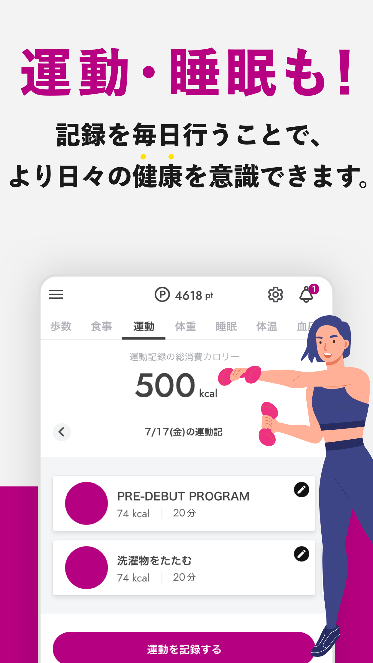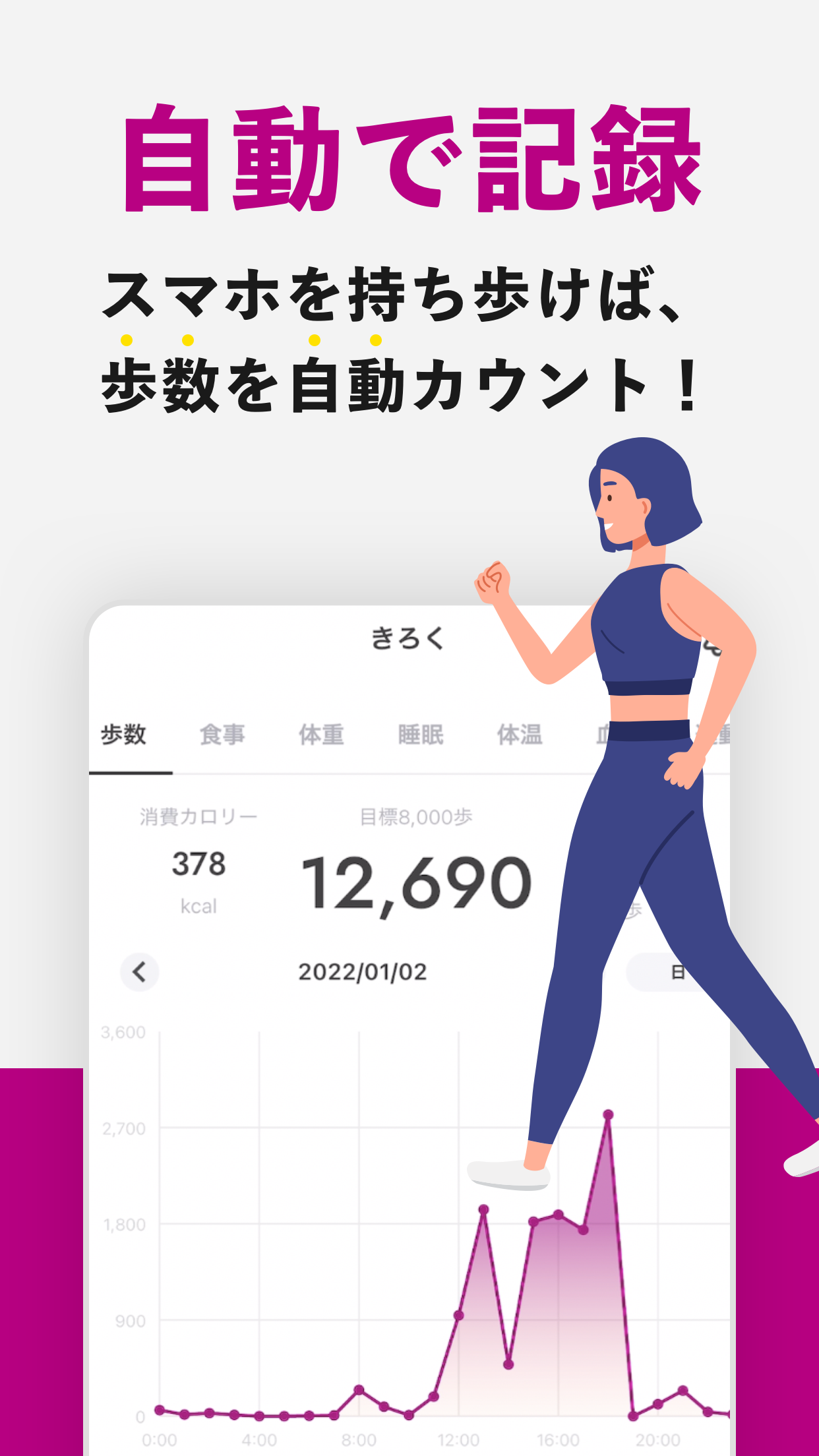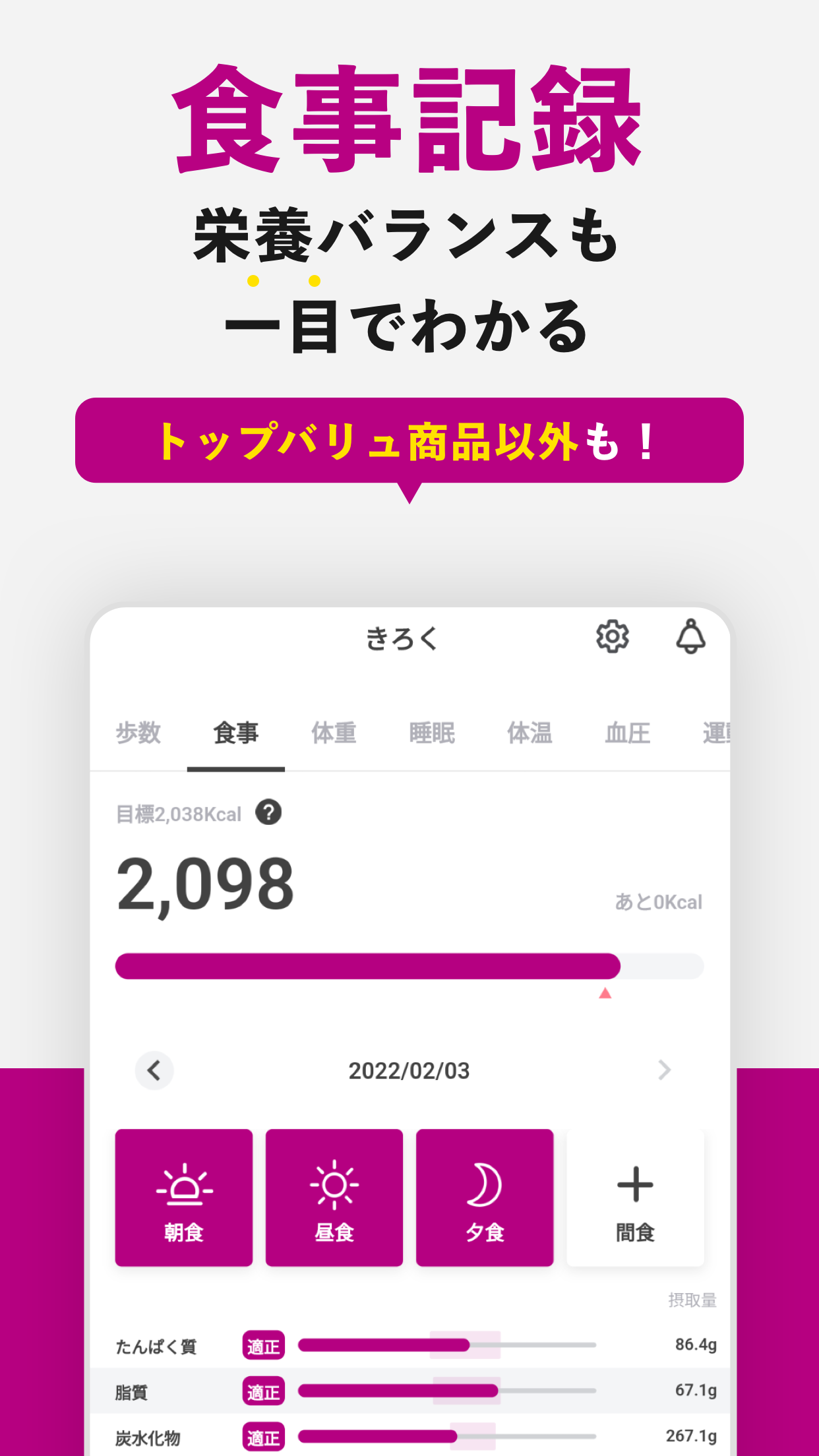 歩数・食事・体重・睡眠・血圧・体温・運動の行動記録を付けられる。ヘルスケア(Apple) やグーグルフィット(Google)などの健康管理アプリとの連動も可能です。
