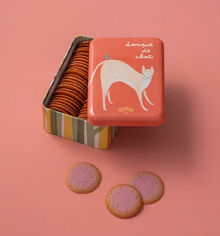 「ラングドシャ」とはフランス語で「猫の舌」という意味で、こちらは兵庫県尼崎市にあるか〈洋菓子店リビエール〉の人気商品。初代シェフからお店を受け継いだ時、製造の効率面を考えて一度は生産をやめていたものの、お客様からのたくさんの復活を待ち望む声を受け、先代のレシピをもとに試作を重ねて復活させた、初代シェフと現2代目の特別な想いが詰まった看板商品です。