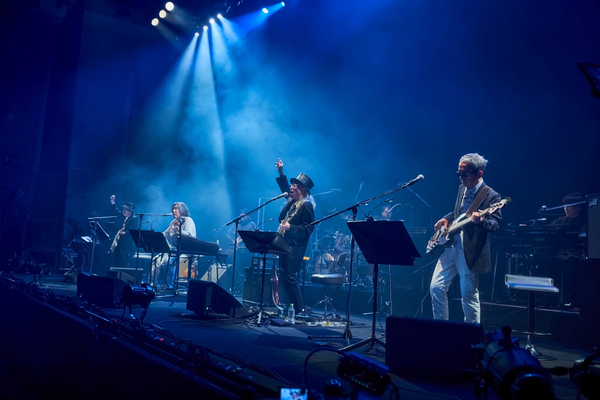 ムーンライダーズは3月15日に全編インプロビゼーションで構成されたアルバム「Happenings Nine Months Time Ago in June 2022」をリリースした。この夜は、各楽曲のイントロやアウトロ、もしくは間奏で即興演奏(インプロビゼーション)を披露。ギターの澤部渡にキーボードの佐藤優介という盤石なサポートを得て、はちみつぱい時代の「月夜のドライヴ(1973)」や、「My Name Is Jack(1978)」、「天罰の雨(2001)」で自由奔放なインプロビゼーションを聴かせる。懐かしいナンバーが2023年の現在と完全にシンクロし、新しい曲を聴いているように思わせるのがムーンライダーズの魔力。彼らの老練さここに極まり!といった趣きだ。