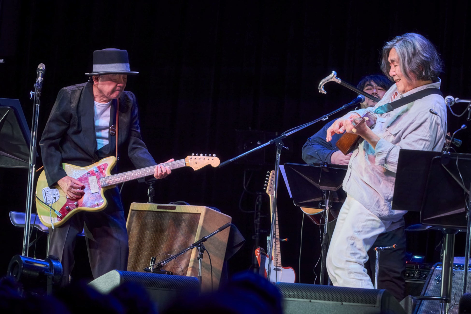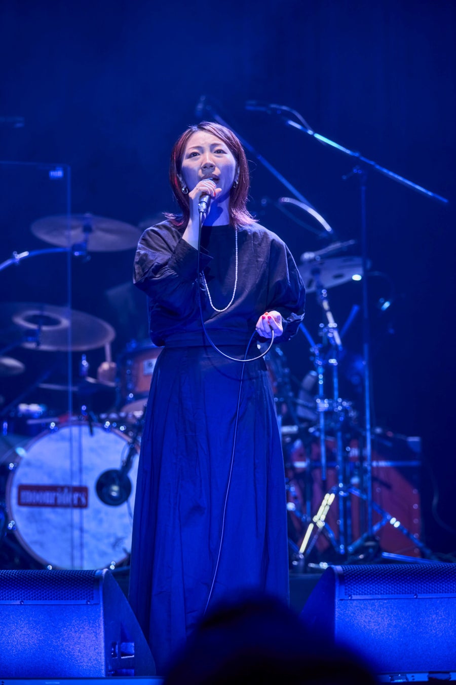 『かしぶち哲郎が亡くなって10年になります』と切り出した鈴木慶一は、8月19日にかしぶちの名盤「リラのホテル」40周年を記念したライブの開催を発表。『ここからはかしぶち君の曲やります!』と、「Beep Beep Be オーライ(1977)」を演奏。続く「Frou Frou(1985)」は、ムーンライダーズ・ライブではお馴染みのナンバー。この辺りから静かに聴いていた客席も熱を帯び始め、「駅は今、朝の中」や「駄々こね桜、覚醒」とアップ・チューンナンバーをたたみ込み、盛り上がりも最高潮に。慶一からの『これ、みんな一緒に歌えるよ!』を合図に始まったのは再びの岡田徹曲「ダイナマイトとクールガイ」。照明も灼熱の南国を彷彿させる「真っ赤」に統一。サビの"♩ダイナマイトとクールガイ僕たち〜愛を試す季節じゃない〜"では、メンバーとオーディエンスが一緒に大合唱し、ステージと客席が一体となって岡田徹を明るく偲んだ。『今日最後の曲です。最初で最後のゲストです!』と鈴木慶一が呼び込んだのは岡田紫苑。岡田徹の娘でもあり、ユニットlittlle moaで活動するミュージシャンだ。このサプライズ・ゲストに客席も大いに沸き、温かい拍手で迎える。ムーンライダーズと共に歌ったのはアルバム「月面讃歌(1998)」に収められた原田知世作詞、岡田徹作曲の「幸せの場所」。かつて岡田のソロアルバムにlittlle moaとして参加した紫苑にとっても思い出深い楽曲だ。静謐さの中に、ほのかな熱を感じさせる彼女の歌声に客席も、じっと聴き入る。歌い終えると、深々とお辞儀をしてメンバーと一緒にステージを降りた。