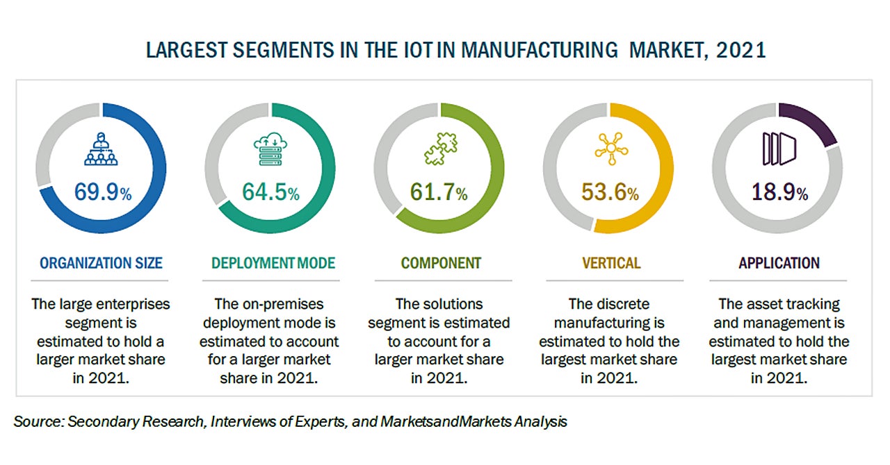 製造業向けIoTの市場規模は、2021年の500億米ドルからCAGR11.9%で成長し、2026年には879億米ドルに達すると予測されています。エコシステムにおける主要プレイヤーの存在により、多様な市場が形成されています。製造業向けIoTは、製造企業が機械と従業員の効率的な作業のために採用するデジタル変革の手法です。この手法では、重要な生産データを収集するためにセンサーのネットワークを採用し、クラウドと分析ソフトウェアを使用して、収集したこれらのデータを製造業務に関する有用な情報に変換しています。IoTの導入は、製造部門はプロセスの自動化を実現し、コスト削減、市場投入までの時間短縮、マスカスタマイゼーション、安全性の向上に活用されています。