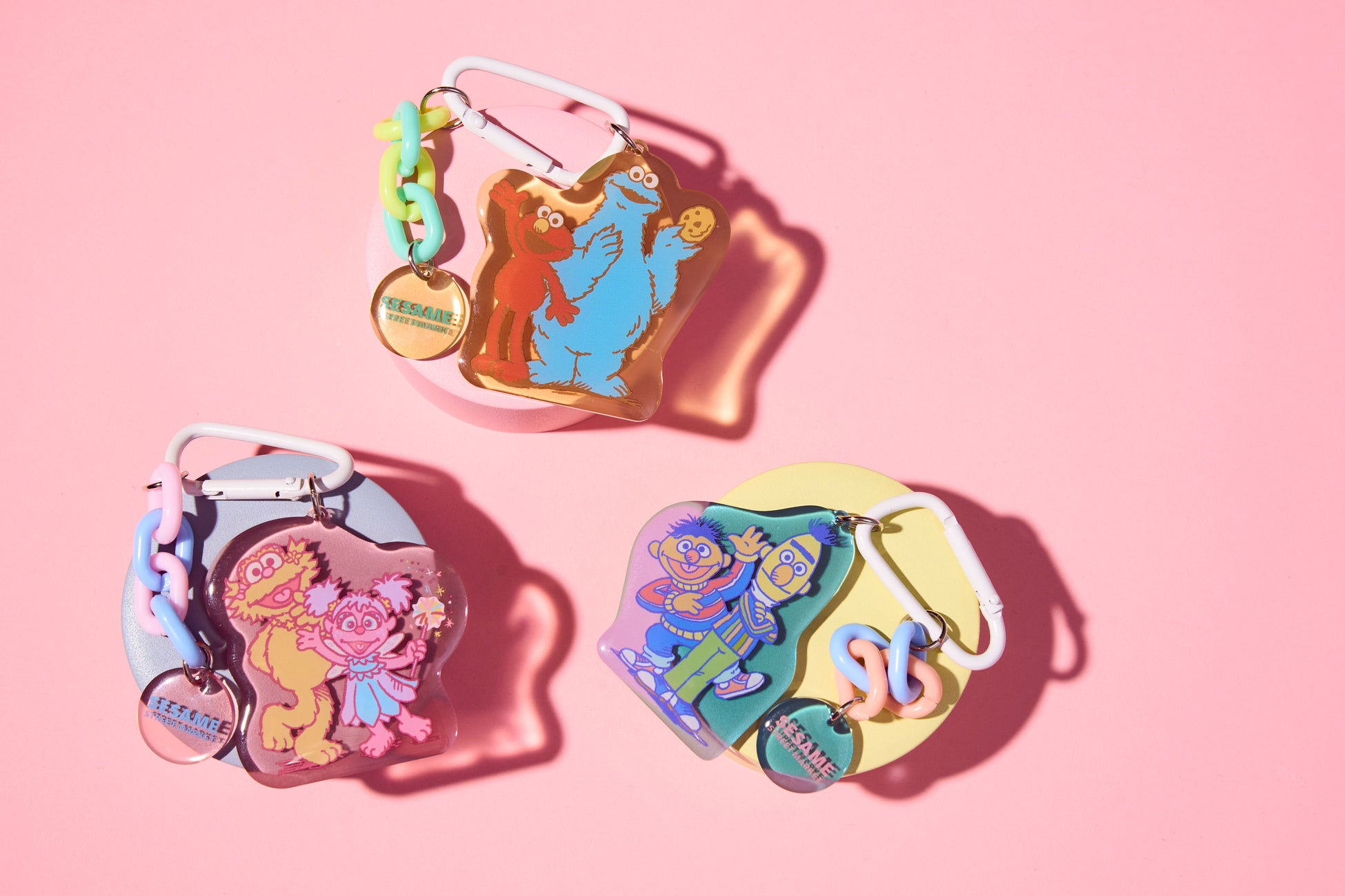 パステルカラーの背景に、パステルカラー調になったセサミストリートのキャラクターたちがマッチしたアクリルキーホルダー。