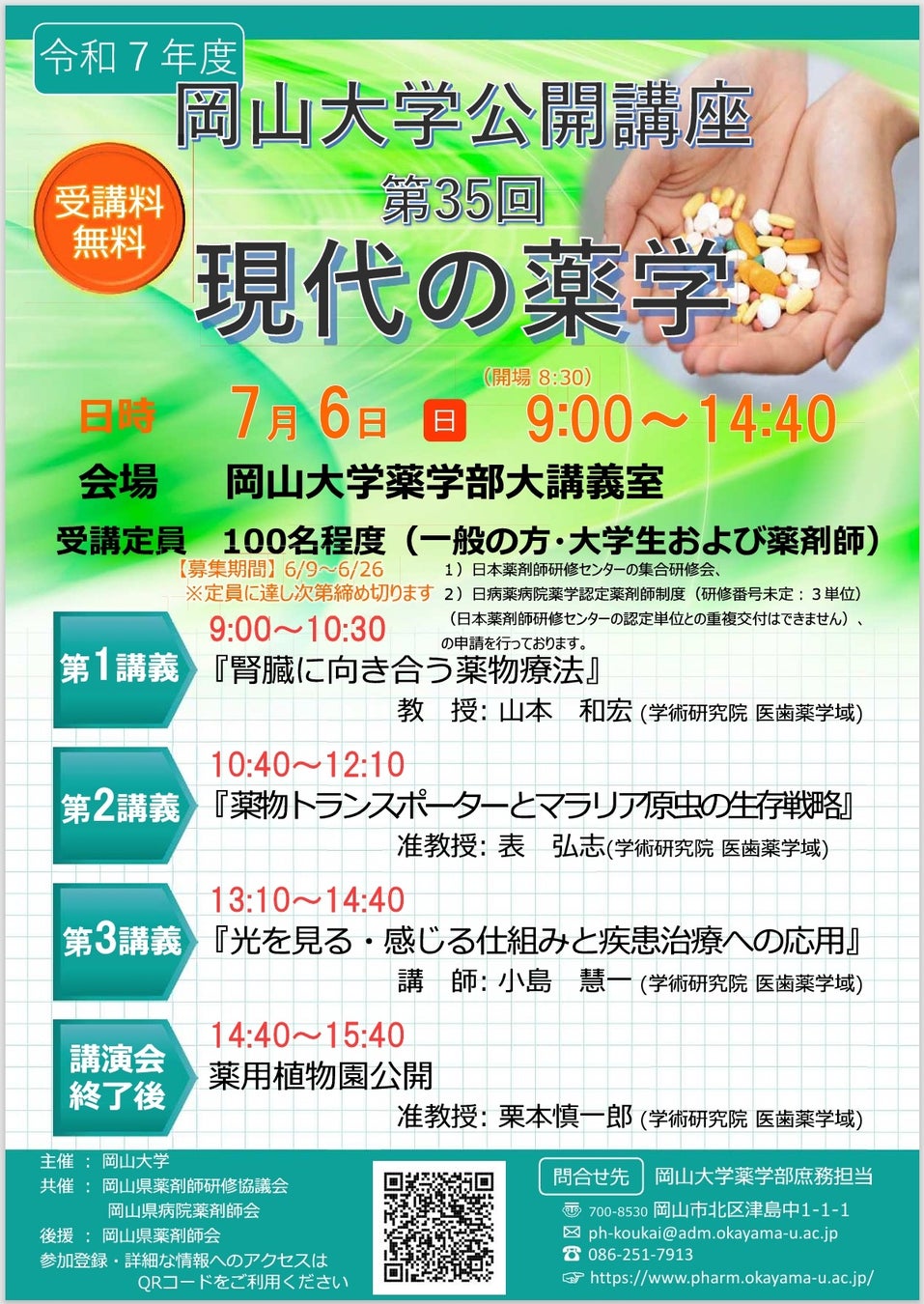 【岡山大学】令和7年度岡山大学公開講座「現代の薬学(第35回)」〔7/6,日 岡山大学津島キャンパス〕