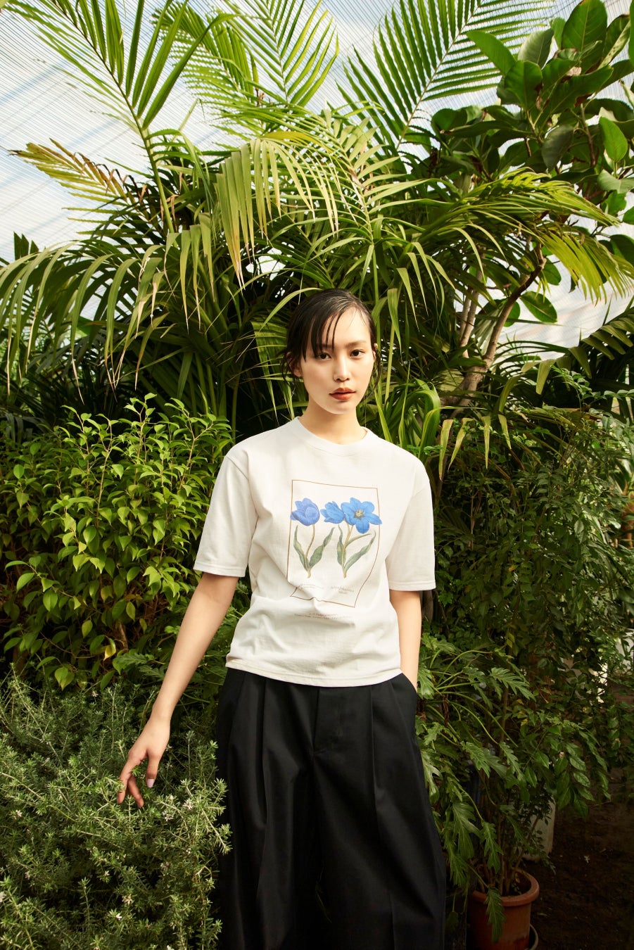 コンパクトなサイズ感で女性らしくスタイリッシュな印象で着用できるボタニカル柄のTシャツ。シンプルにワイドパンツと合わせて。