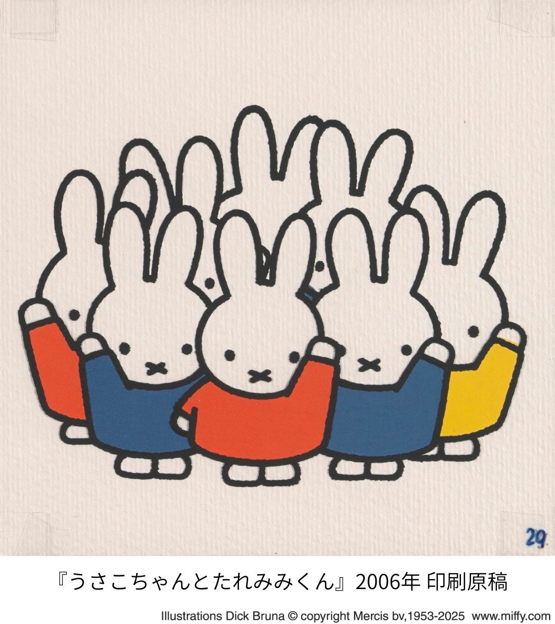 初来日となる『うさこちゃんおとまりにいく』(1988年)、『うさこちゃんのだいすきなおばあちゃん』(1996年) の2作品に『うさこちゃんとたれみみくん』(2006年) を加えた3作品からは、特に多くの原画や資料を紹介します。考え抜かれたシンプルな色と線で、子どもたちに対してやさしく正直に