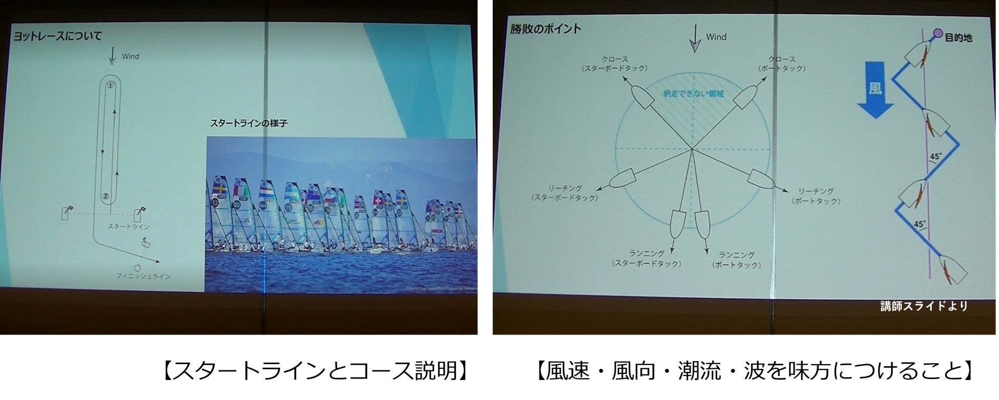 ゴールの速さを競うという点ではシンプルに見えますが、講師のお話を聞くところセーリング競技は実に複雑なスポーツだと感じました。それは風速・風向・潮流・波など常に自然環境が変化し続けるなかで「いかにその次を予測しライバルを出し抜くか」が勝利のポイントだからです。頭と身体の両方をフルに使わないといけないのがセーリング競技の魅力のようで、講師は始めてすぐ、虜になってしまったそうです。