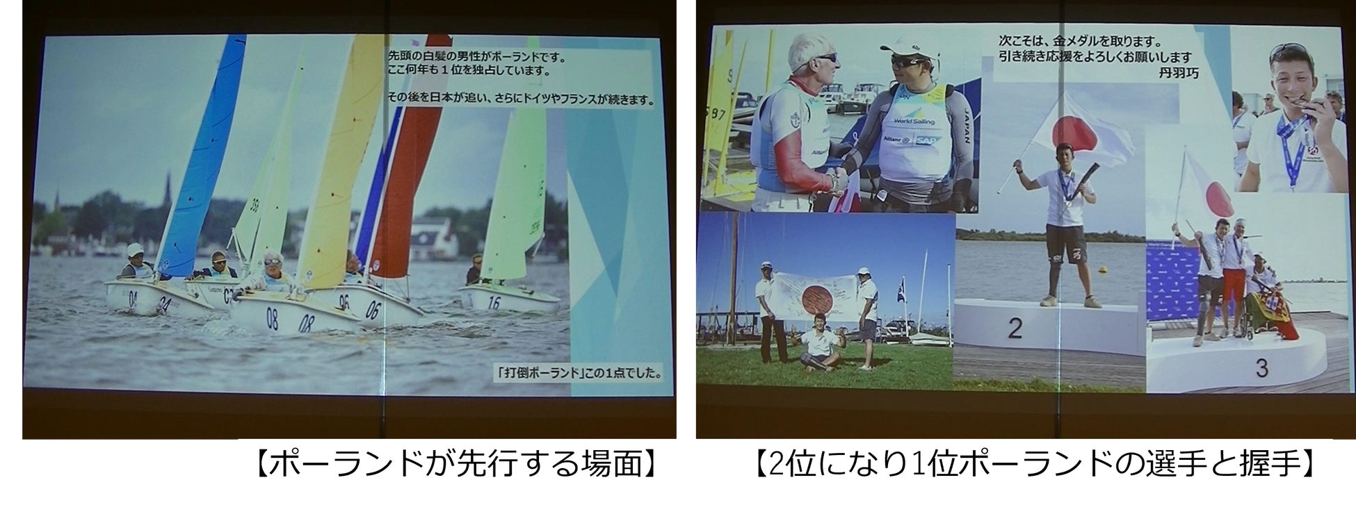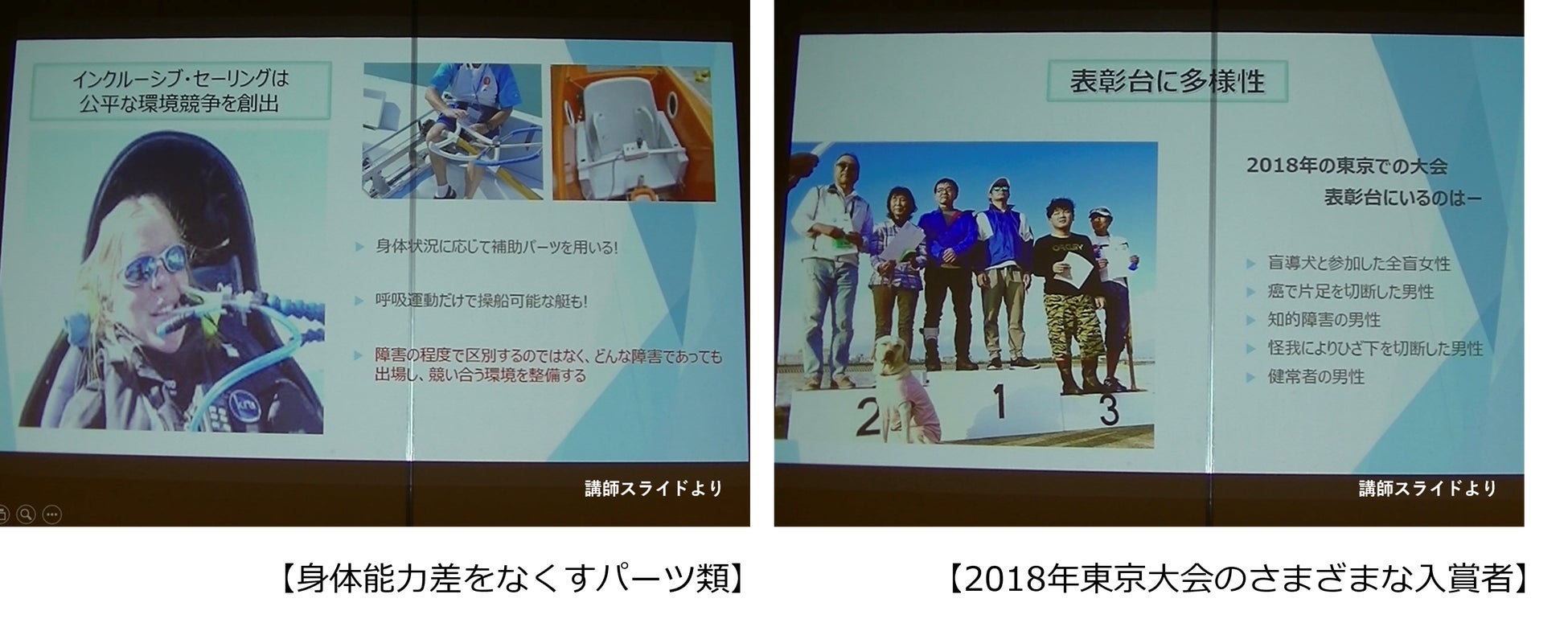 講師が挑戦するハンザ級(クラス)はインクルーシブ・セーリングのために開発されました。その目的は障がいの有無・年齢・性別などの区別なくセーリングを通じ交流をすること、障がいの程度でクラス分けをせず、障がい者と健常者が同レースで競い合うこと、競技者・指導者・運営は適性や希望に応じて担当すること、これらを通じてあらゆる多様性を巻き込んだ活動を目指しているそうです。セーリングの勝敗を分けるのは「風を見極める」「潮を見極める」「波を見極める」「他艇との位置関係を見極める」「他艇の戦略を見抜く」と言った身体能力以外の要素で、身体条件が勝敗の決定要因ではないとのことでした。そのためハンザは身体能力差が極めて縮まるような設計がされており障がいの度合いに合わせ補助パーツを装着することができます。首から下が動かない選手でも呼吸運動だけで操船可能なパーツもあるそうです。2018年東京大会では盲導犬と参加した全盲女性・癌で闘病の末、片足を切断した男性・知的障がいの男性・怪我によりひざ下の切断した男性・健常者の男性が表彰台に上りました。下の写真(右)は性別、年齢、障がいの有無に関係なく勝負ができている象徴的な写真だと講師は語ります。