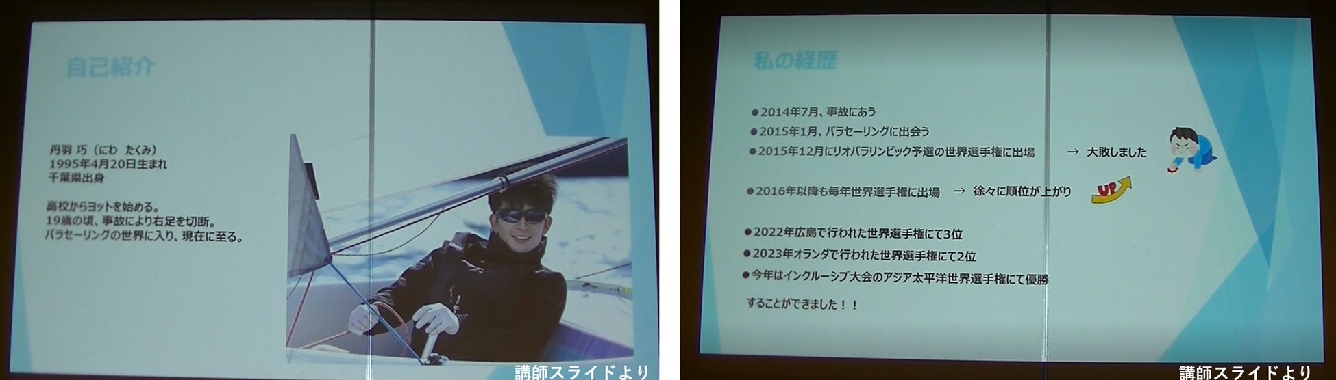 第8回目の講座は、一昨年「セーリング世界選手権(オランダハーグで開催)」に日本代表として出場(パラ種目・男子ハンザ303級)し、世界の強豪を相手に銀メダルという素晴らしい成績を残されたセーラーの丹羽巧(にわ たくみ)さんをお迎えしました。