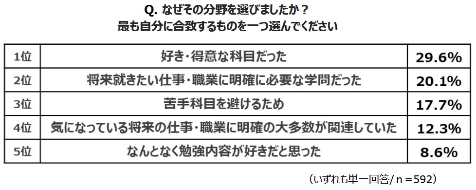 高校3年生に、希望する進路は文系・理系どちらかを聞くと、文系が54.7%、理系が41.0%、未定が4.2%という結果となりました。さらに、なぜその分野を選んだのか理由を聞くとTOP5は、1位「好き・得意な科目だった」、2位「将来就きたい仕事・職業に明確に必要な学問だった」、3位「苦手科目を避けるため」、4位「気になっている将来の仕事・職業の大多数が関連していた」、5位「なんとなく勉強内容が好きだと思った」という結果に。大きな軸は2つで、「得意・苦手」と「将来就きたい仕事」だと分かりました。