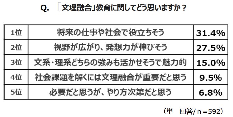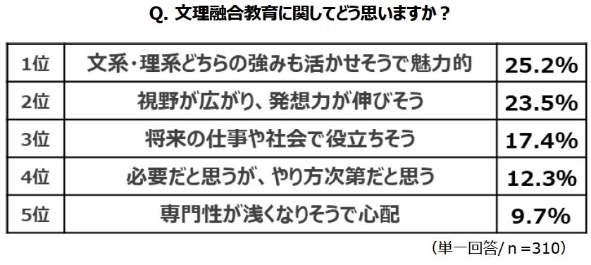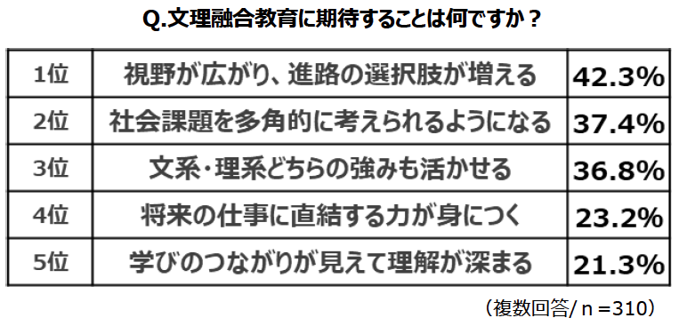 保護者に対し、文系・理系のどちらの要素も併せ持ち横断的に学んでいく“文理融合教育”について聞きました。まず、イメージについては、1位「文系・理系どちらの強みも活かせそうで魅力的」、2位「視野が広がり、発想力が伸びそう」、3位「将来の仕事や社会で役立ちそう」と、いずれもポジティブな項目が上位に挙がりました。また、期待することを聞くと、1位「視野が広がり、進路の選択肢が増える」、2位「社会課題を多角的に考えられるようになる」、3位「文系・理系どちらの強みも活かせる」という結果に。ピンポイントのスキル装着などではなく、どちらの良さも取り入れながら視野を広げることを総じて期待しているようです。