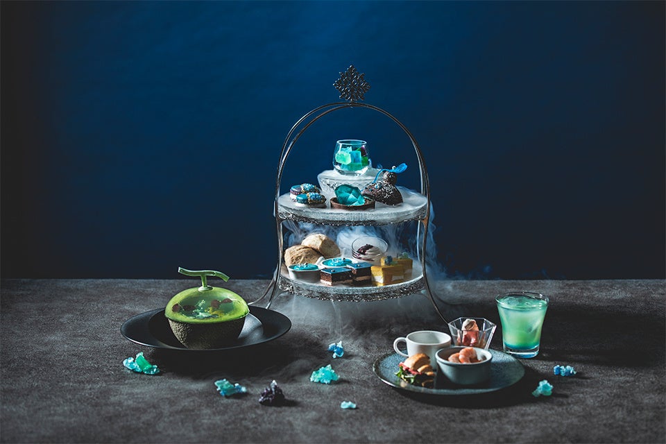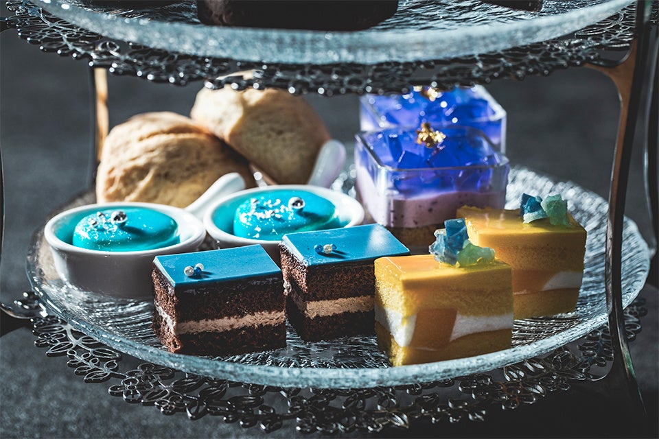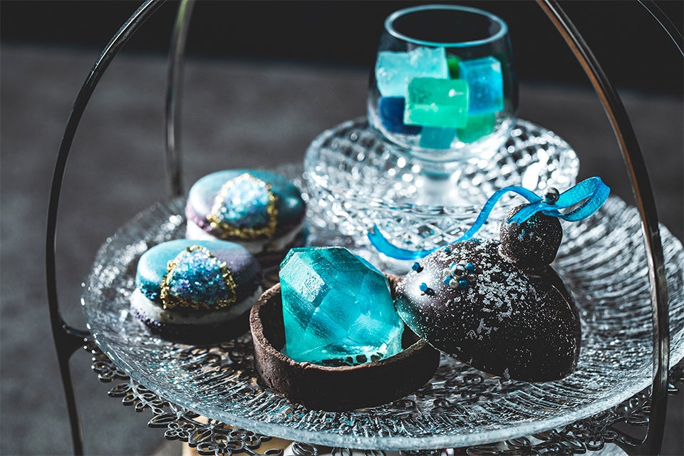 上段の主役は“宝石箱”そのものをスイーツで表現した「ジュエルボックスショコラ」。チョコレートで出来たボックスの中で、大きなダイヤモンドの形をしたポートワインゼリーが輝きます。また、昨今SNSで「食べる宝石」として人気の琥珀糖も注目のアイテム。表面のシャリシャリ感と、寒天の柔らかい2つの食感が楽しめ、加えてカメラ必須のドライアイス演出が心弾ませます。下段は、サファイアやタンザナイトを彷彿させる「ブルーベリーのムース」、「青いチーズケーキ」のほか、ティーフーズには欠かせないスコーンなどがお皿いっぱいに並びます。