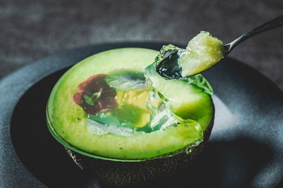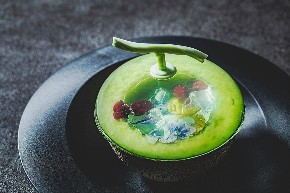 更にお1人さま1皿ずつセイボリープレートと、メロン半玉を器にしたフルーツポンチをご用意。艶やかに煌めくゼリーの蓋を崩しながら、メロンの果肉をすくってお召し上がりいただきます。