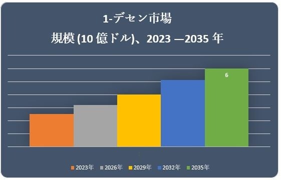 世界の 1-デセン市場は、予測期間、つまり 2023 ―2035 年にかけて最大 10% の CAGR で成長することにより、2035 年末までに最大 60 億米ドルの収益を獲得すると推定されています。さらに、市場は 2022 年に約 20 億米ドルの収益を生み出しました。市場で有利な成長機会を生み出すことに起因する主な要因は、製造部門の拡大と、トランスミッション、コンプレッサー、潤滑剤、ギアオイルなどの多くの製造業での原材料としてのPAOの使用です。