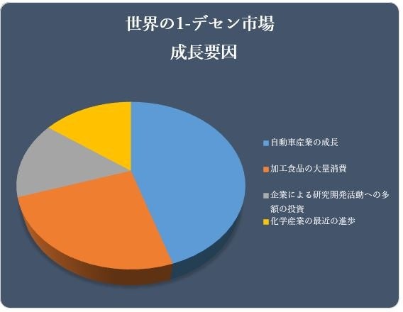 自動車産業の成長は、1-デセン市場の成長を牽引する主要な要因の 1 つです。 1-デセンは、高品質の潤滑剤、防食剤、および高抵抗力として、自動車および製造業で広く採用されています。 この傾向は、評価期間中の 1-デセンの需要を増加させると予測されています。 最近の統計によると、世界の自動車産業は 2030 年までに約 9 兆米ドルに達すると予想されています。