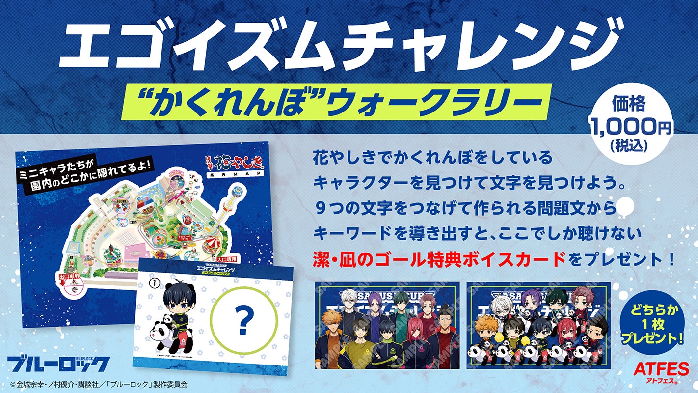 パンダカーに乗ったミニキャラたちを探しに行こう!ミニキャラたちのパネルには文字が1文字ずつ書いてあるので全部の文字を集めて問題文を完成させよう!問題文の答えであるキーワードを導き出せたら、潔・凪のゴール特典ボイスカード(全2種)を1枚プレゼントします。