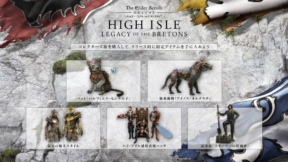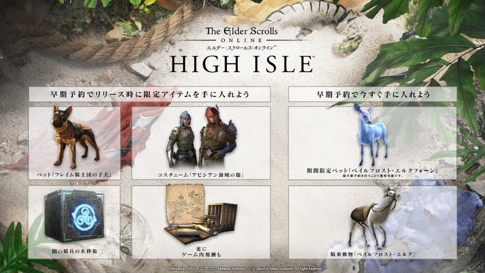 権利表記 :Published by EXNOA LLC (c)2022 ZeniMax Media Inc. The Elder Scrolls(R)Online: High Isle(TM) developed by ZeniMax Online Studios LLC, a ZeniMax Media company. ZeniMax, The Elder Scrolls, High Isle, ESO, ESO Plus, Bethesda, Bethesda Softworks and related logos are registered trademarks or trademarks of ZeniMax Media Inc. in the US and/or other countries. All Rights Reserved.