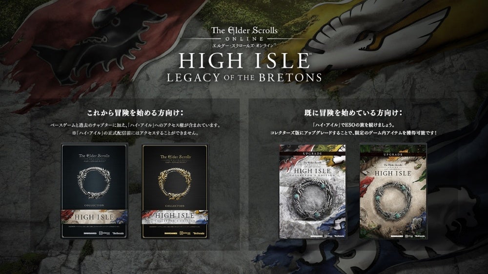 ・『コレクションコレクターズ版』:『コレクション通常版』の内容に加えて、「モロウウィンド」、「サマーセット」、「エルスウェア」、「グレイムーア」、「ブラックウッド」「ハイ・アイル」の限定インゲームアイテム「コレクターズパック」も付属するとてもお得な内容となっています。
