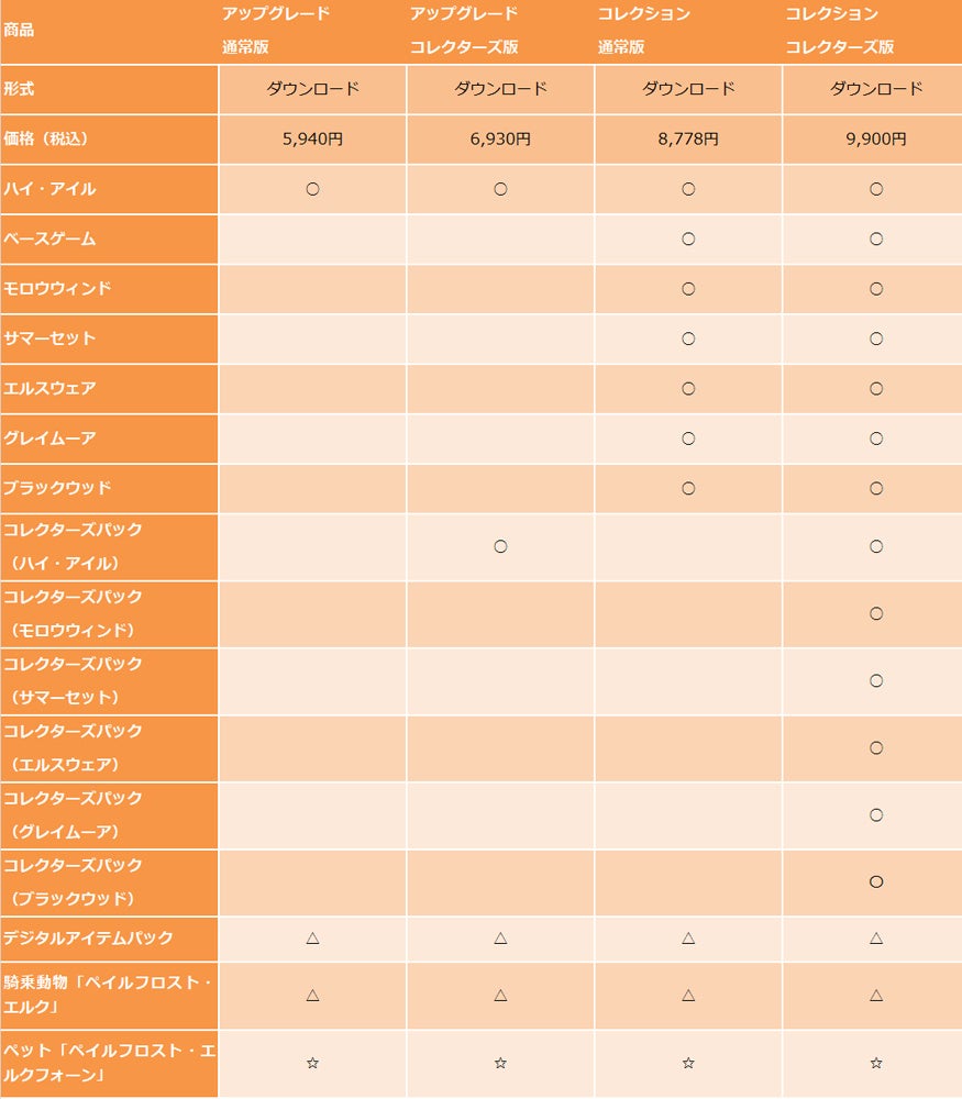 ・『アップグレードコレクターズ版』:騎乗動物「アメノス・オルナウグ」やペット「バルフィエラ・センチの子」などが含まれる、コレクターズ版限定インゲームアイテム「コレクターズパック」が付属します。