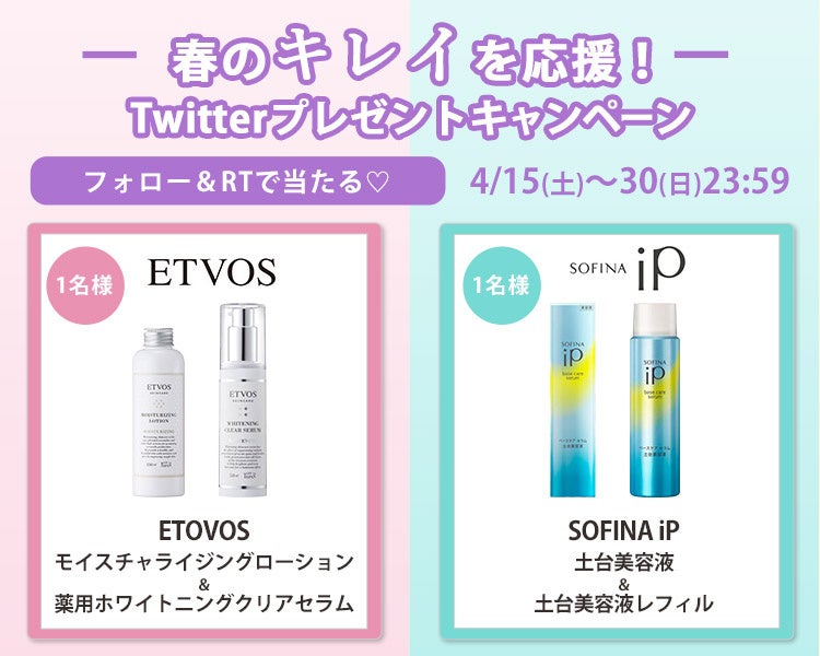 期間中、下記の参加方法でご応募いただくと抽選で「ETVOSスキンケアセット」「ソフィーナ アイピースキンケアセット」を各1名さまにプレゼントいたします。