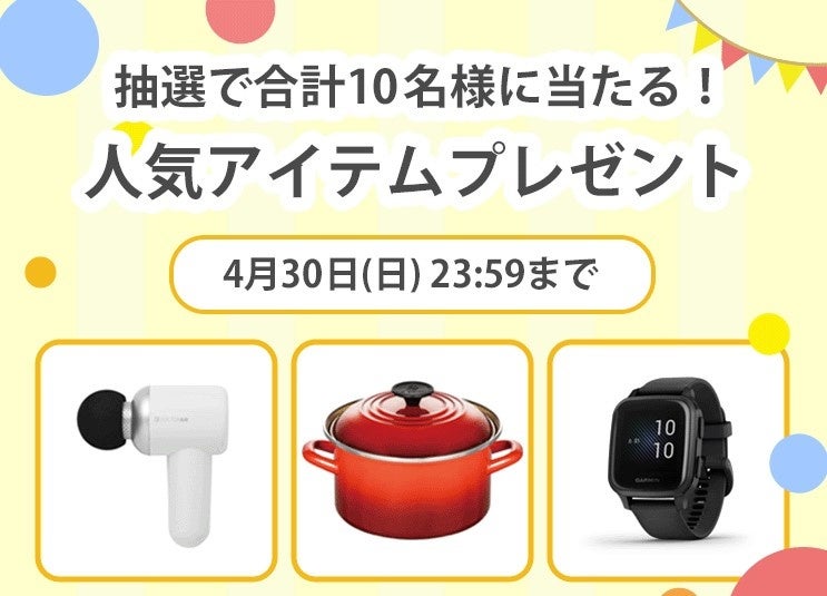 下記URLからエントリーいただいた方の中から、抽選でキッチングッズや美容家電などの人気アイテムを計10名の皆さまにプレゼントいたします。