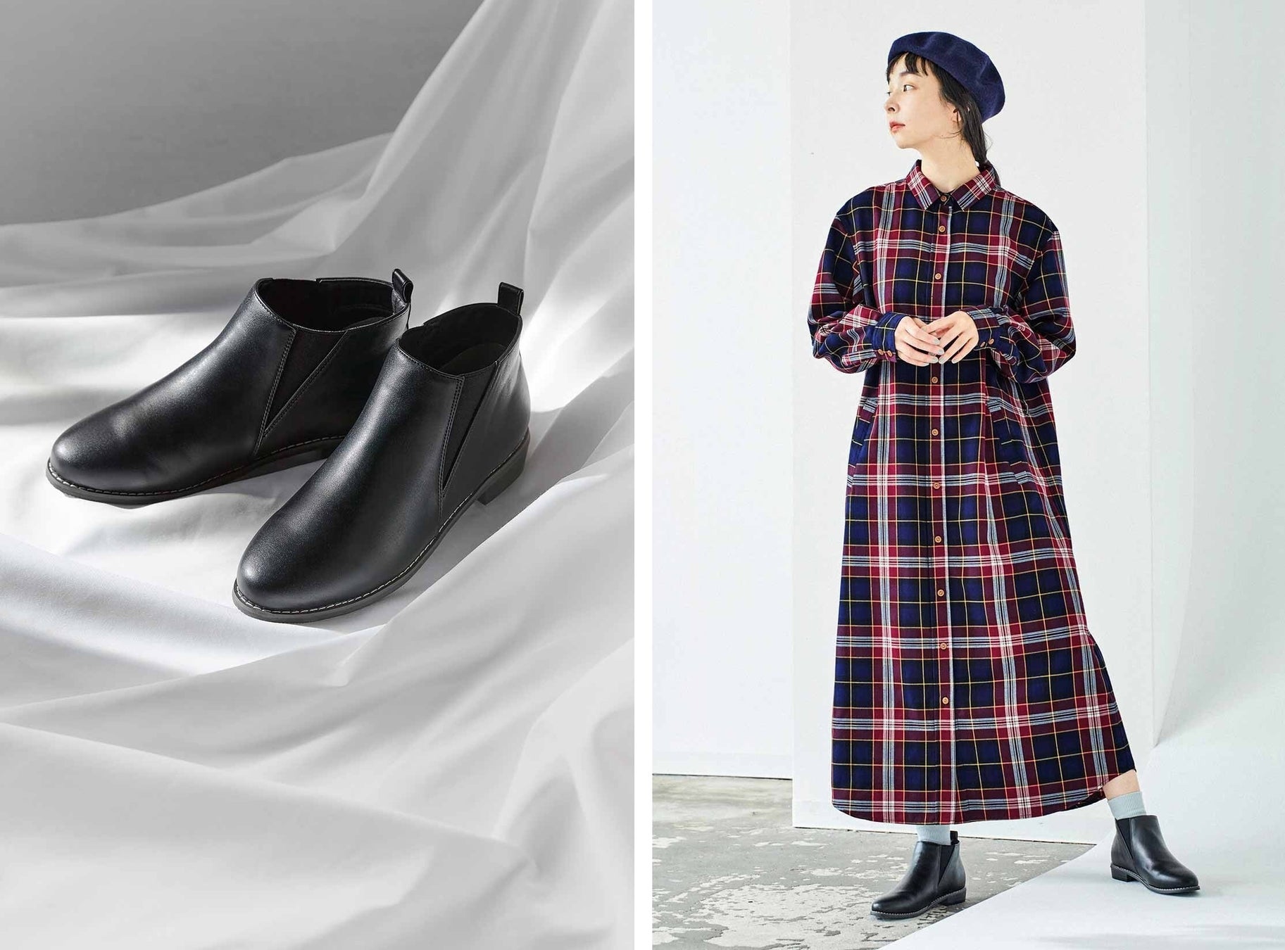 ロングセラーのシューティが秋冬向けにブーティデザインに進化しました。シューティと同じしなりのいいソールで疲れにくく、サイドゴムで履きやすさも抜群です。本革のような質感の合皮とトラッドなステッチが特徴で、秋冬のスタイルにもマッチし、コーディネートを選びません。