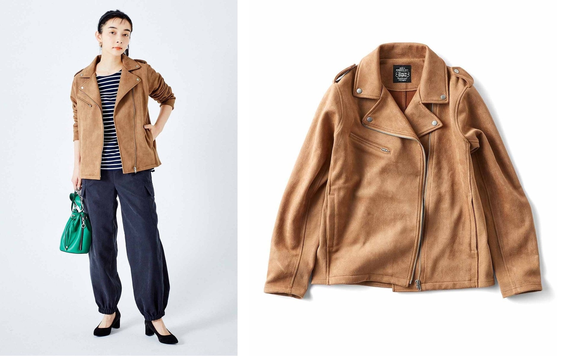 毎年発売しているライダースジャケットは、前作のデザインを継承しつつ、現代のトレンドに合わせてシルエットを少し大きめにし、丈を少し長めにアップデートしました。スエード調の伸びやかなカットソー素材と、窮屈感を軽減するためのサイドと袖下部分のリブ素材の切り替えにより、動きやすく、長時間着ても疲れません。様々なスタイリング、ロングスカートやワイドパンツなど、ボリューム感のあるボトムスにもバランスよく着られます。