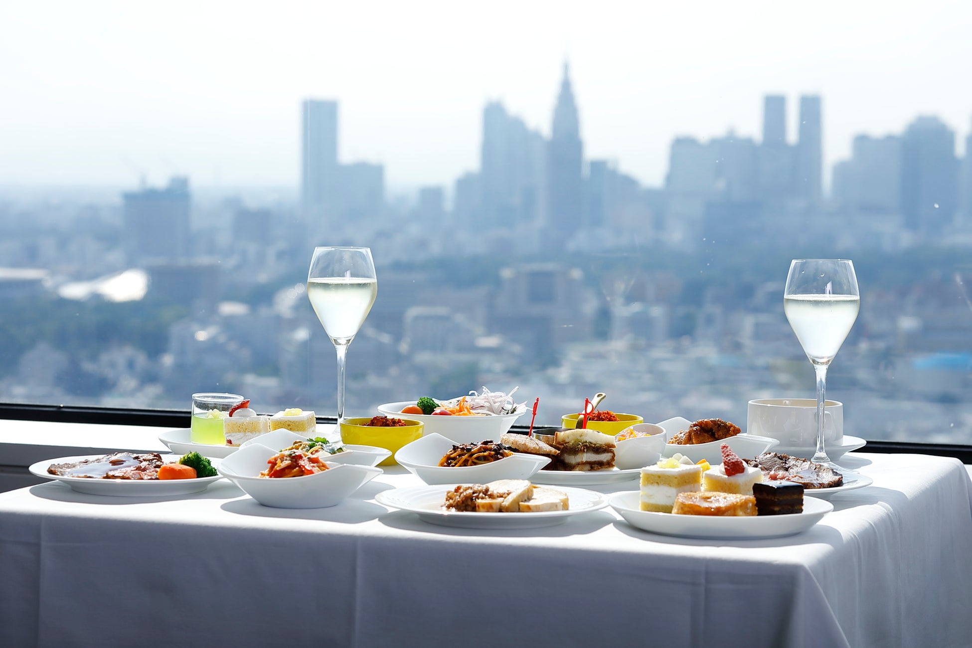ローストビーフや「美味と健康」をテーマにした、プラントベースフードも揃う、最上階からの眺望付きビュッフェ。(平日限定)