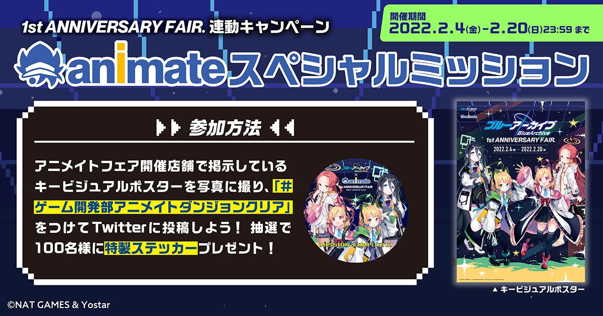 アニメイトフェア開催店舗で掲示しているキービジュアルポスターを写真に撮り、「#ゲーム開発部アニメイトダンジョンクリア」をつけてTwitterに投稿しよう!抽選で100名様に特製ステッカープレゼント!