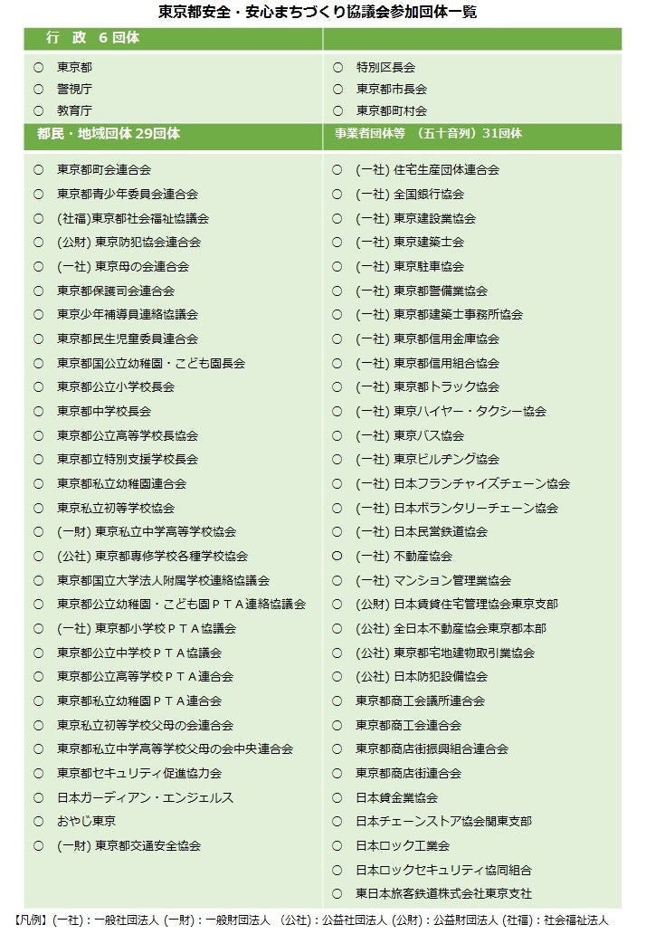 区市町村、事業者、地域団体等と協働して自主的な犯罪防止活動や犯罪防止に配慮した環境整備を促進するた め、平成15年度に設置(参加団体:以下のとおり)