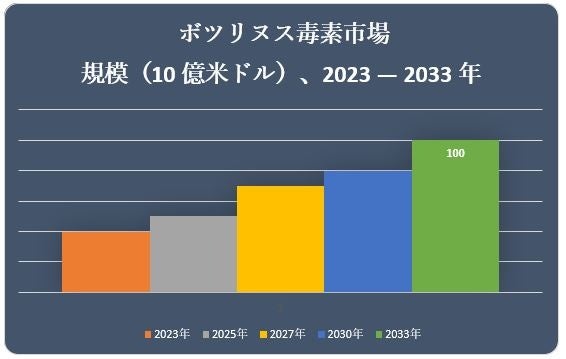 世界のボツリヌス毒素市場は、2023 ―2033 年の予測期間中に最大 9% の CAGR で成長することにより、2033 年末までに最大 100 億米ドルの収益を獲得すると推定されています。さらに、市場は 2022 年に約 40 億米ドルの収益を生み出しました。市場の成長は、多くの健康や皮膚の問題に対処する傾向がある高齢者人口の割合が世界的に増加していることに起因する可能性があります。